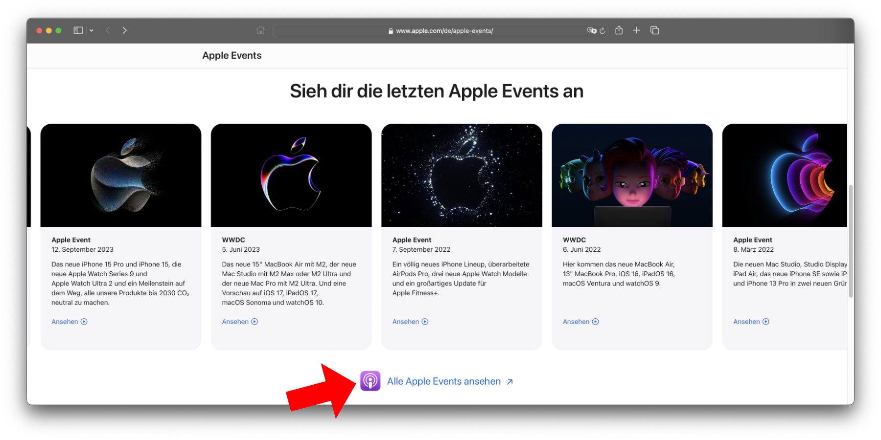 Neben dem Link zur Gesamtübersicht auf der „Apple Events“-Seite der Podcasts App gibt es auch noch die Möglichkeit, direkt zu den Audio- und zu den Video-Übersichten zu gelangen: Hier zu den Audios und hier zu den Videos. Meine Empfehlung ist dabei, unter der Folgen-Liste der verlinkten Seiten auf „Alle anzeigen“ zu klicken bzw. am Mobilgerät zu tippen. Denn dann werden nicht nur alle bisher hochgeladenen Inhalte angezeigt – sie werden auch chronologisch geordnet. So könnt ihr aktuell vom „Scary Fast“-Event vom 30. Oktober 2023 bis zur „Macworld San Francisco“-Keynote vom 9. Januar 2007 scrollen. Da wurde erstmals das iPhone vorgestellt.