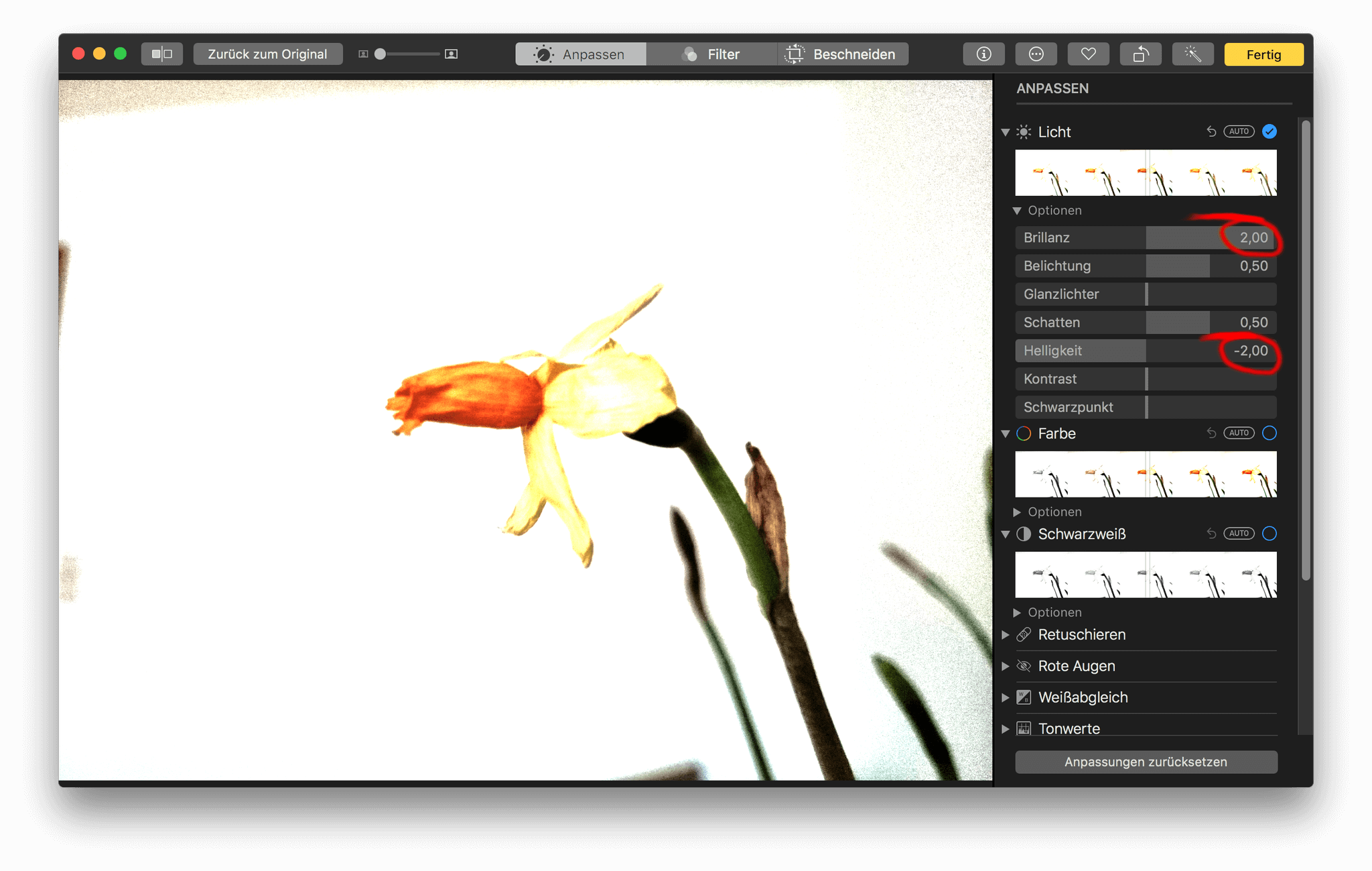 - Unter „Licht“ lassen sich bspw. „Brillanz“ und „Helligkeit“ verdoppeln
