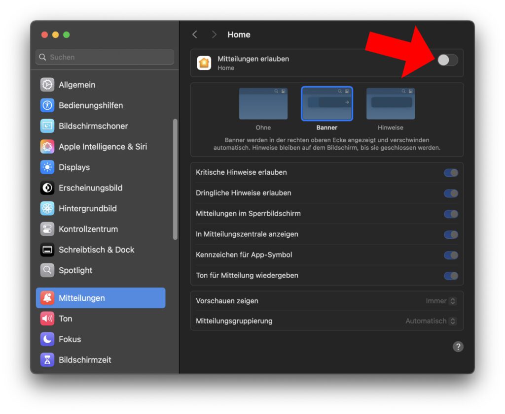 Apple Home Mitteilungen in den Mac-Einstellungen deaktivieren