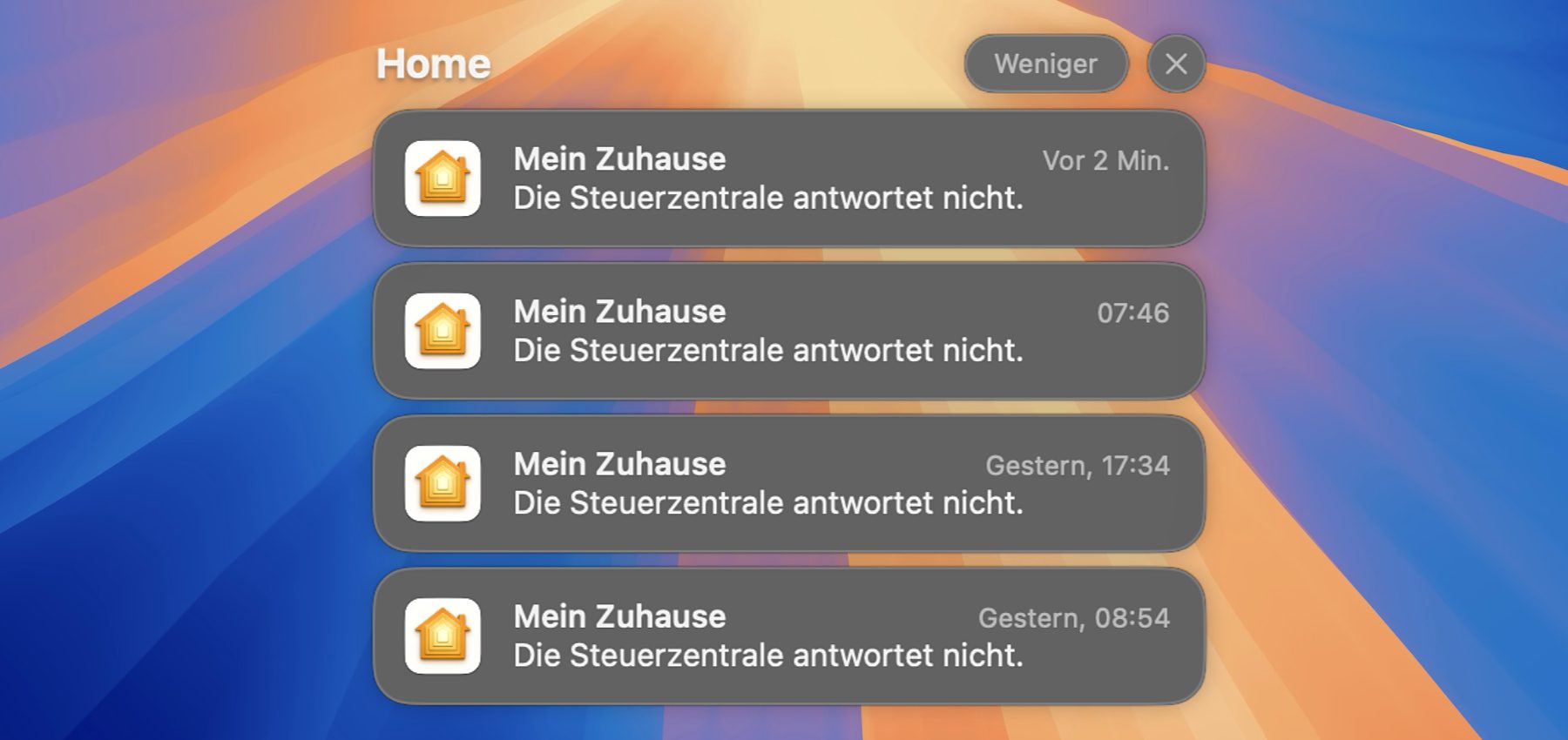 Letztens habe ich nach einer Weile mal wieder meinen Apple TV an den Beamer angeschlossen, weil ich einen Film im Großformat schauen wollte. Seitdem meldet mein Mac mit macOS 15 Sequoia mehrmals am Tag: Die Steuerzentrale antwortet nicht. Das ist eine Meldung von Home, also der Smart-Home-Verwaltung Apples. Da ich kein Smart Home eingerichtet und keine Geräte vernetzt habe, brauche ich aber weder die Home App noch den Apple TV als Steuerzentrale. Wenn euch das ebenso geht, zeige ich euch hier, wie man die nervigen Meldungen ausschalten kann.