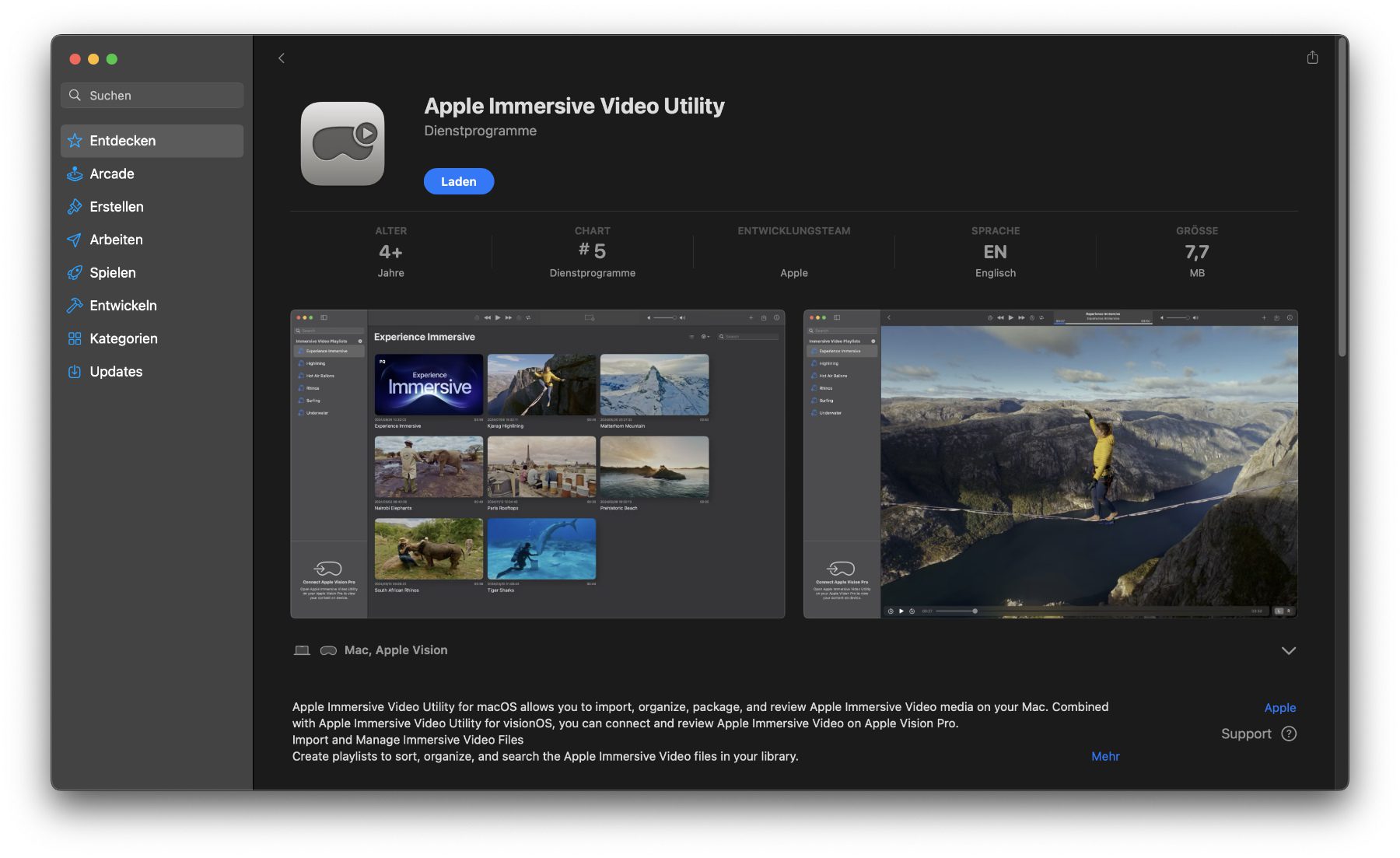 Die neue App Apple Immersive Video Utility ermöglicht das Importieren, Verpacken und Ausspielen von Videos im .aivu-Format. Die Software steht gratis im App Store für Mac und Vision Pro zur Verfügung, richtet sich aber mehr an professionelle User denn an Laien. Für private User ist eher die Apple Vision Pro App interessant, die ab iOS 18.4 auf dem iPhone genutzt werden kann.