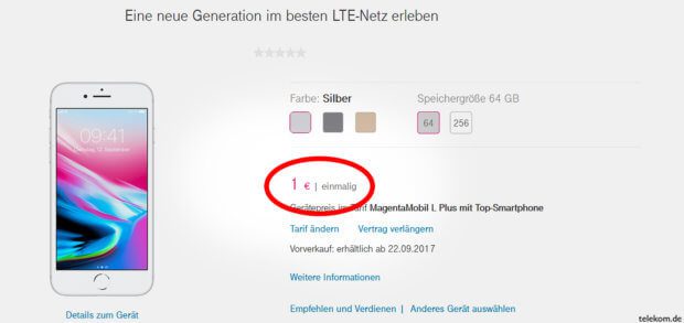 Letzte Woche hat Apple in seiner alljährlichen September-Keynote die beiden Smartphones iPhone 8 und iPhone 8 Plus vorgestellt. Die von Apple vorgegebenen Preise für die beiden iPhones liegen bei 799€ bis 1.079€ ohne Mobilfunkvertrag. Wenn ihr nun eine Möglichkeit sucht, das iPhone 8 oder das iPhone 8 Plus günstiger zu kaufen, und zwar mit einem Handyvertrag, dann sind vielleicht die Angebote der Telekom etwas für euch. Sicher nicht die günstigsten Verträge fürs iPhone, dafür aber sehr umfangreich ;)