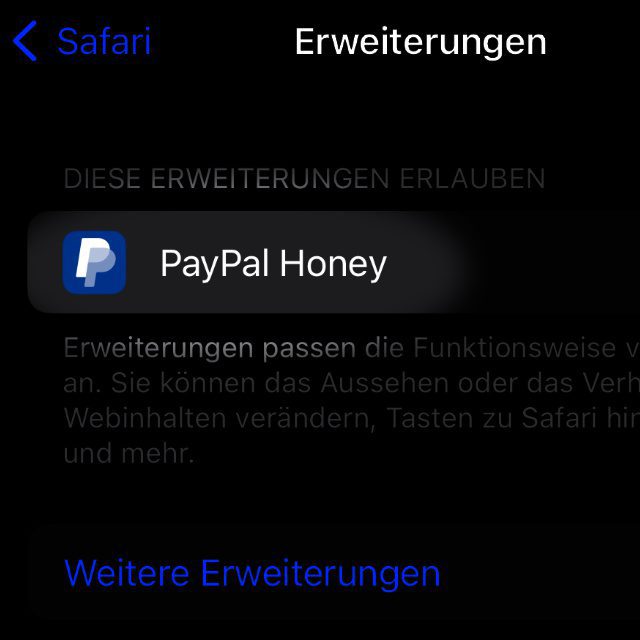 Beim Stöbern in den Optionen der iOS-Version von Safari sowie in deren Einstellungen bin ich auf eine Erweiterung namens „PayPal Honey“ gestoßen. Ich konnte mich nicht daran erinnern, sie installiert zu haben. Und im App Store findet man unter dem Namen auch keinen Hinweis auf ein Safari-Plugin. Handelt es sich also um Malware?