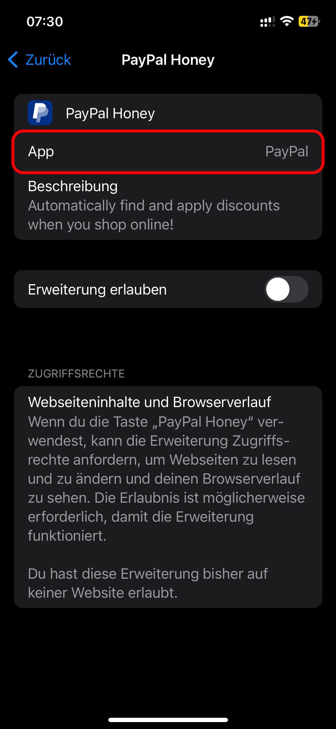 Befindet ihr euch also gerade in Einstellungen -> Safari -> Erweiterungen, dann tippt „PayPal Honey“ an. So findet ihr noch mehr Informationen dazu. Zum Beispiel wird neben „App“, also der Herkunftsanzeige der Erweiterung, „PayPal“ genannt. So seht ihr, dass es sich um eine Erweiterung aus seriöser Quelle handelt und nicht um Schadsoftware. Ganz unten steht zudem wahrscheinlich dieser Satz: „Du hast diese Erweiterung bisher auf keiner Website erlaubt.“ Entsprechend wurden auch keine Daten abgerufen.