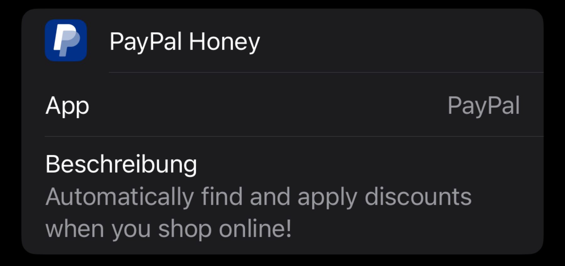 „Honey“ kennen einige von euch sicher als Browser-Plugin. Es soll aktuelle Gutscheincodes, Cashbacks, Aktionen und Rabatte für Onlineshops suchen, sodass diese beim Einkauf in denselben automatisch angewendet werden. Honey gibt es als App und Safari-Erweiterung im App Store. Jedoch ist das nicht der einzige Vertriebsweg für das Spar-Angebot. Es wird auch mit PayPal respektive der PayPal App gebündelt auf Endgeräte gebracht. Dies ist erkennbar an dem Namen „PayPal Honey“ in der Übersicht der Safari-Erweiterungen.