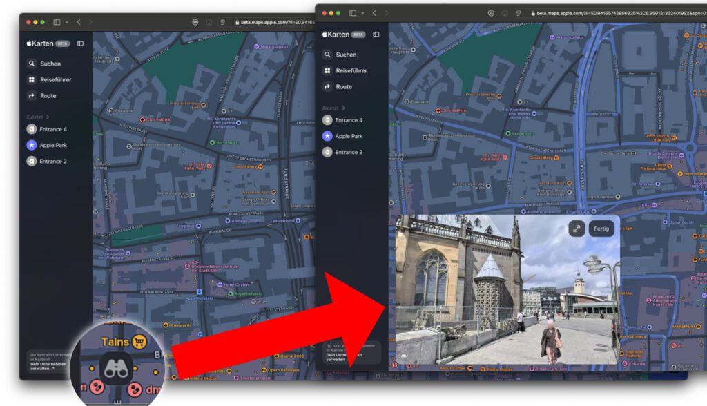 Seit Juli bietet Apple seine Karten nicht mehr nur als App für Mac, iPhone, iPad und Co. an, sondern auch online für die Nutzung im Webbrowser. Das noch im Beta-Stadium befindliche Angebot bietet bereits einige bekannte Funktionen, etwa die Routenplanung oder Guides für ausgesuchte Orte und Regionen. Seit kurzem ist auch das Umsehen-Feature nutzbar, welches in den Geräte-Apps schon länger genutzt werden kann – und bei Google Maps als „Street View“ bereits seit 2007 angeboten wird.