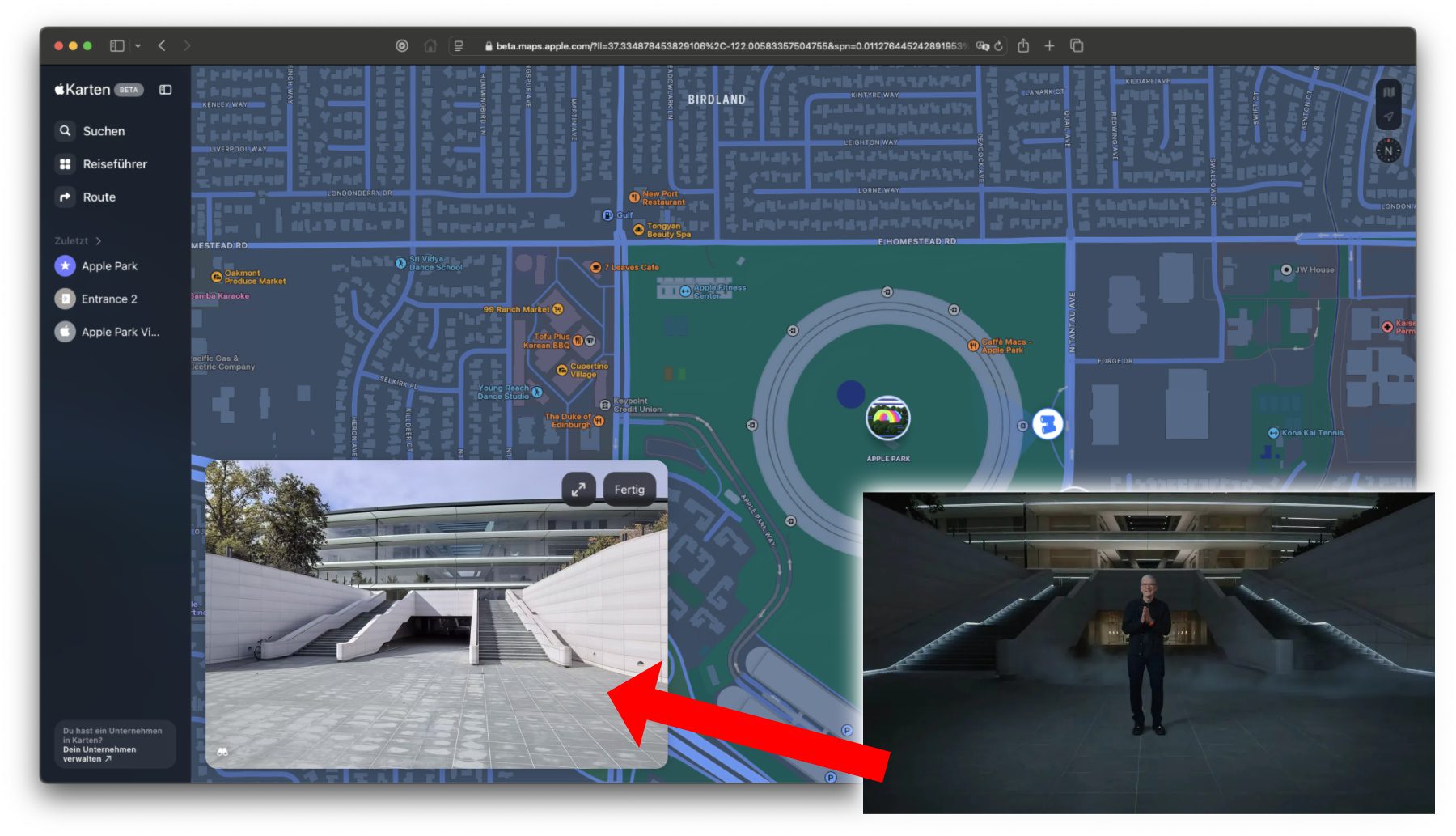 Mit dem Umsehen-Feature bietet Apple sogar einen kleinen Einblick in den Apple Park – oder zumindest die Ansicht einer der Eingänge. Genau jener, an dem Tim Cook letztes Jahr durch die Oktober-Präsentation des Unternehmens („Scary Fast“) führte, kann virtuell besucht werden. Der damals cinematisch in Szene gesetzte Ort sieht bei Tageslicht betrachtet wenig spektakulär aus.