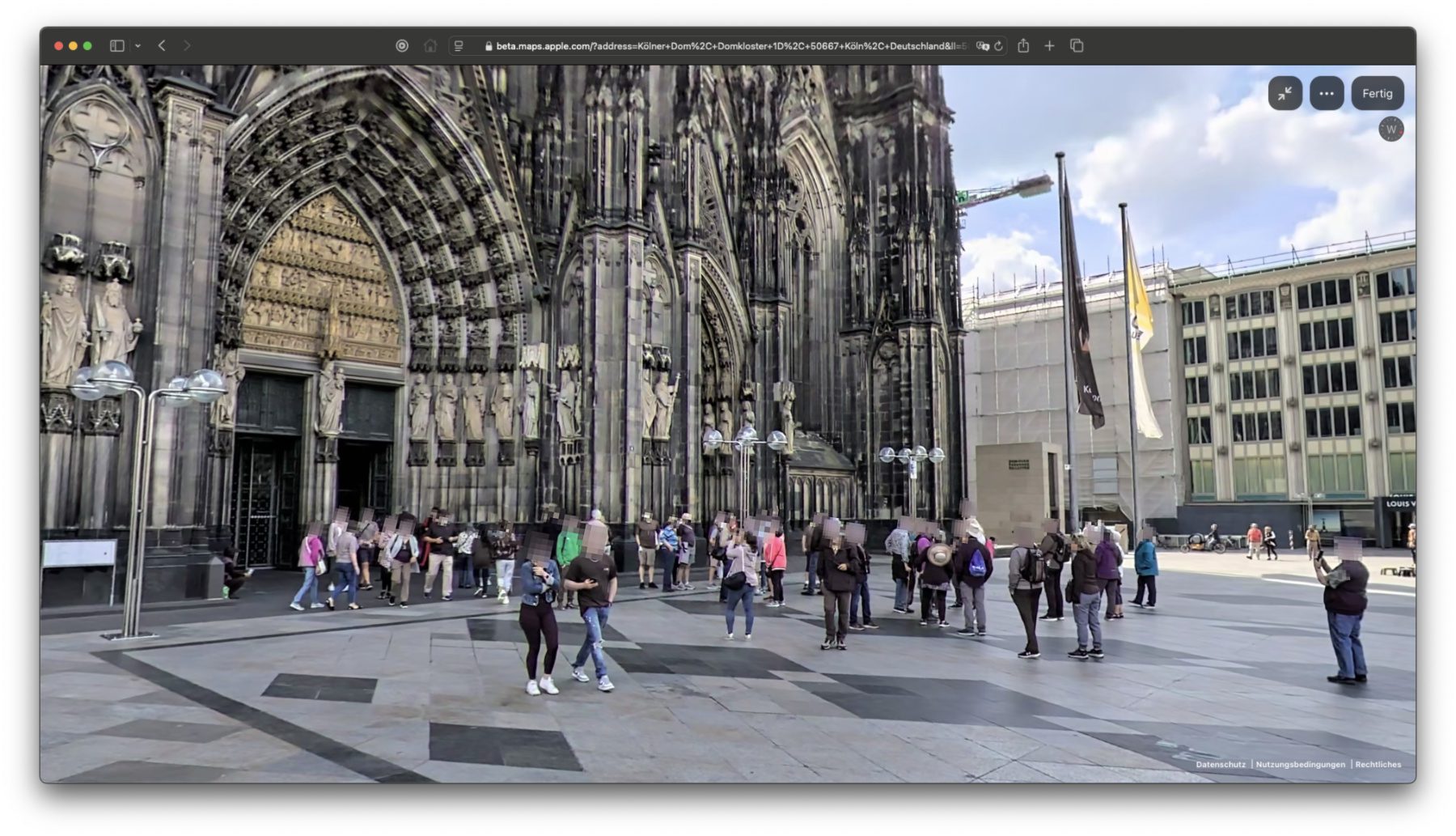 Seit Juli bietet Apple seine Karten nicht mehr nur als App für Mac, iPhone, iPad und Co. an, sondern auch online für die Nutzung im Webbrowser. Das noch im Beta-Stadium befindliche Angebot bietet bereits einige bekannte Funktionen, etwa die Routenplanung oder Guides für ausgesuchte Orte und Regionen. Seit kurzem ist auch das Umsehen-Feature nutzbar, welches in den Geräte-Apps schon länger genutzt werden kann – und bei Google Maps als „Street View“ bereits seit 2007 angeboten wird.