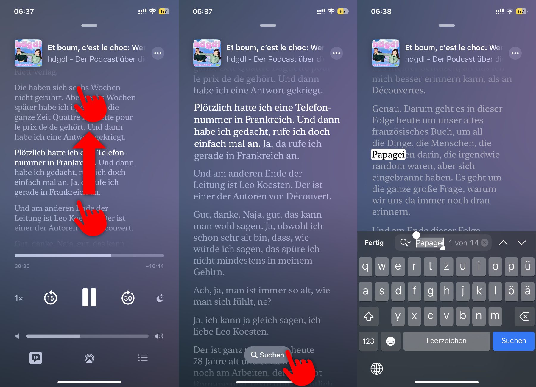 Die Textsuche in Podcast-Transkripten ist nicht ganz intuitiv auffindbar. So findet ihr sie: