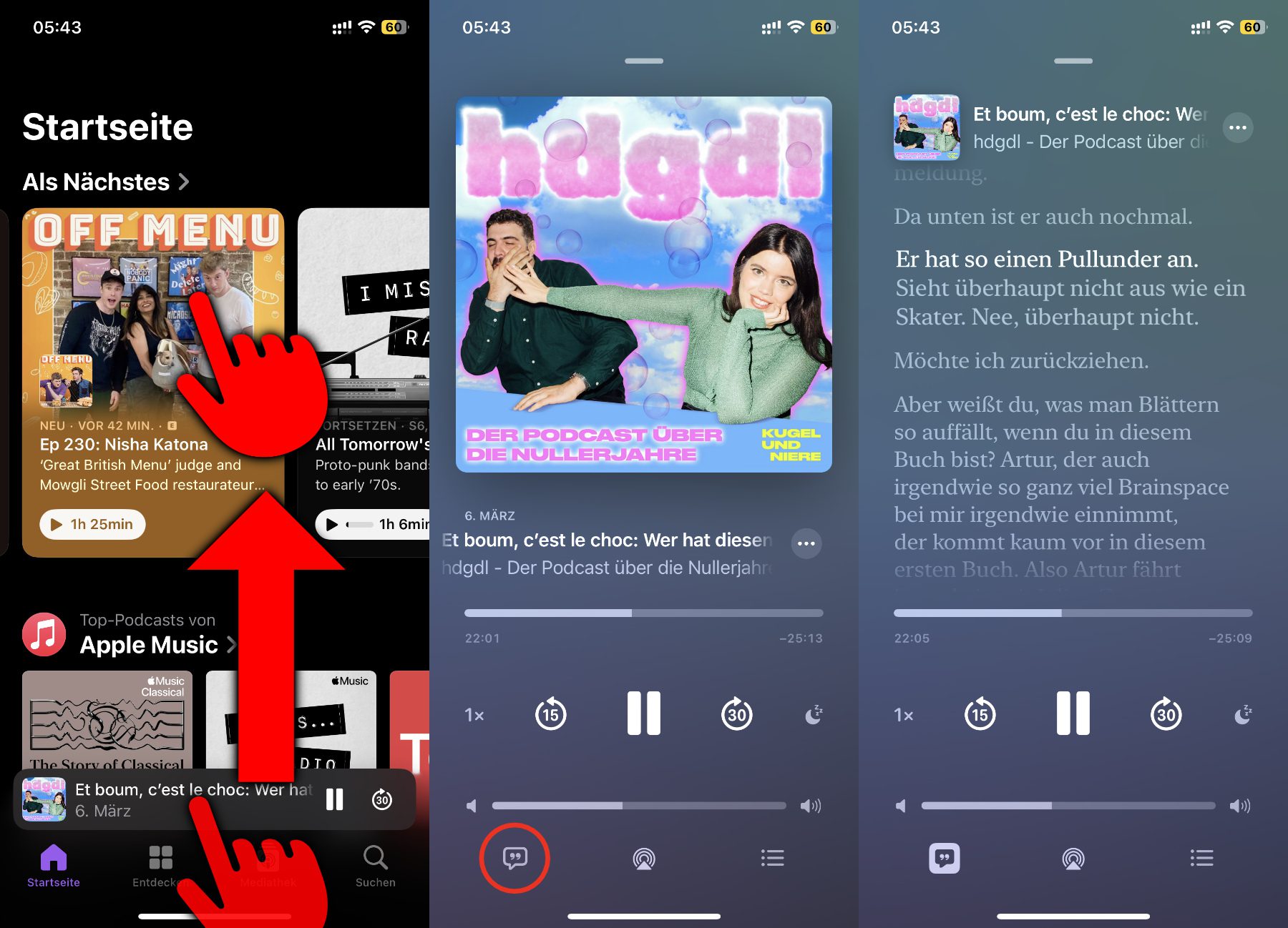 Die Podcasts App öffnen, die aktuelle Wiedergabe aufrufen, unten links auf das Sprechblasen-Symbol tippen und schon wird der Text angezeigt.
