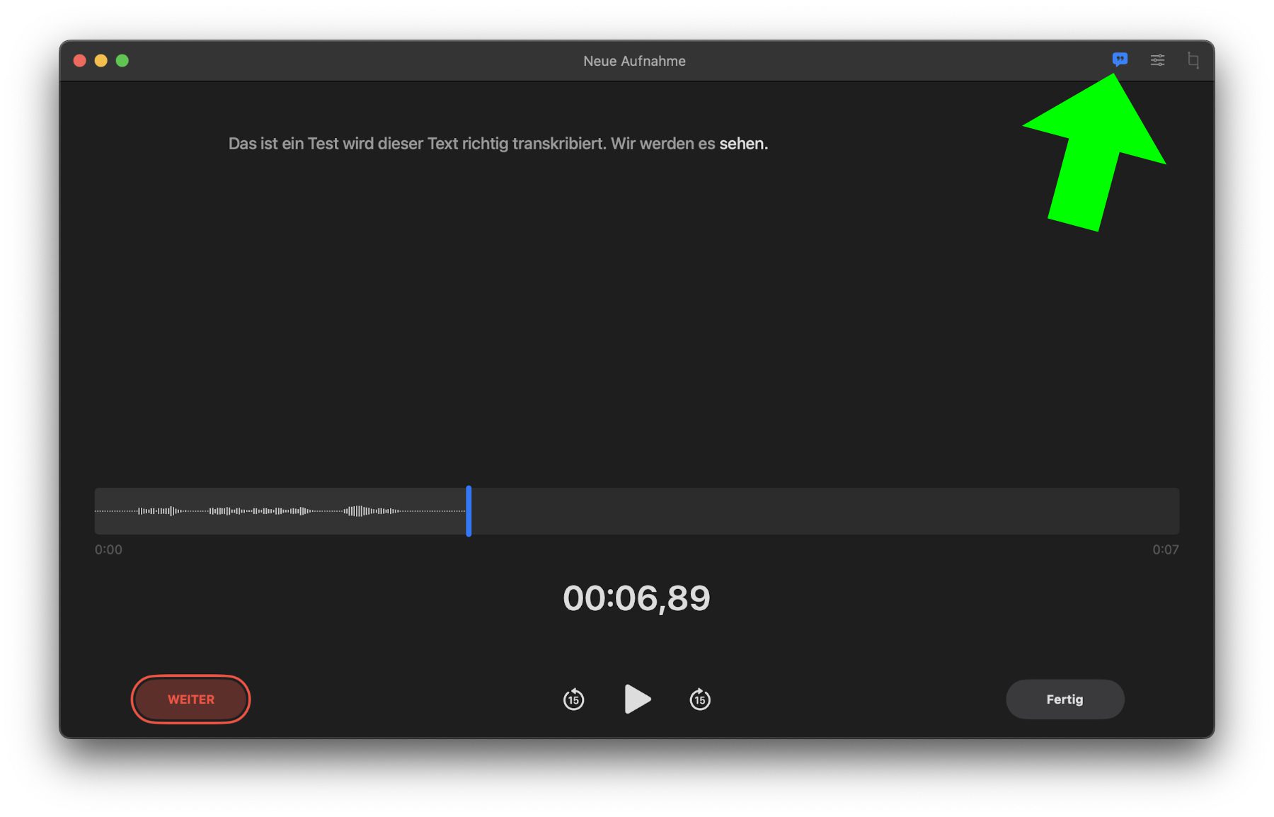 - Nach Beendigung der Aufnahme oben rechts auf das Sprechblase-Symbol klicken