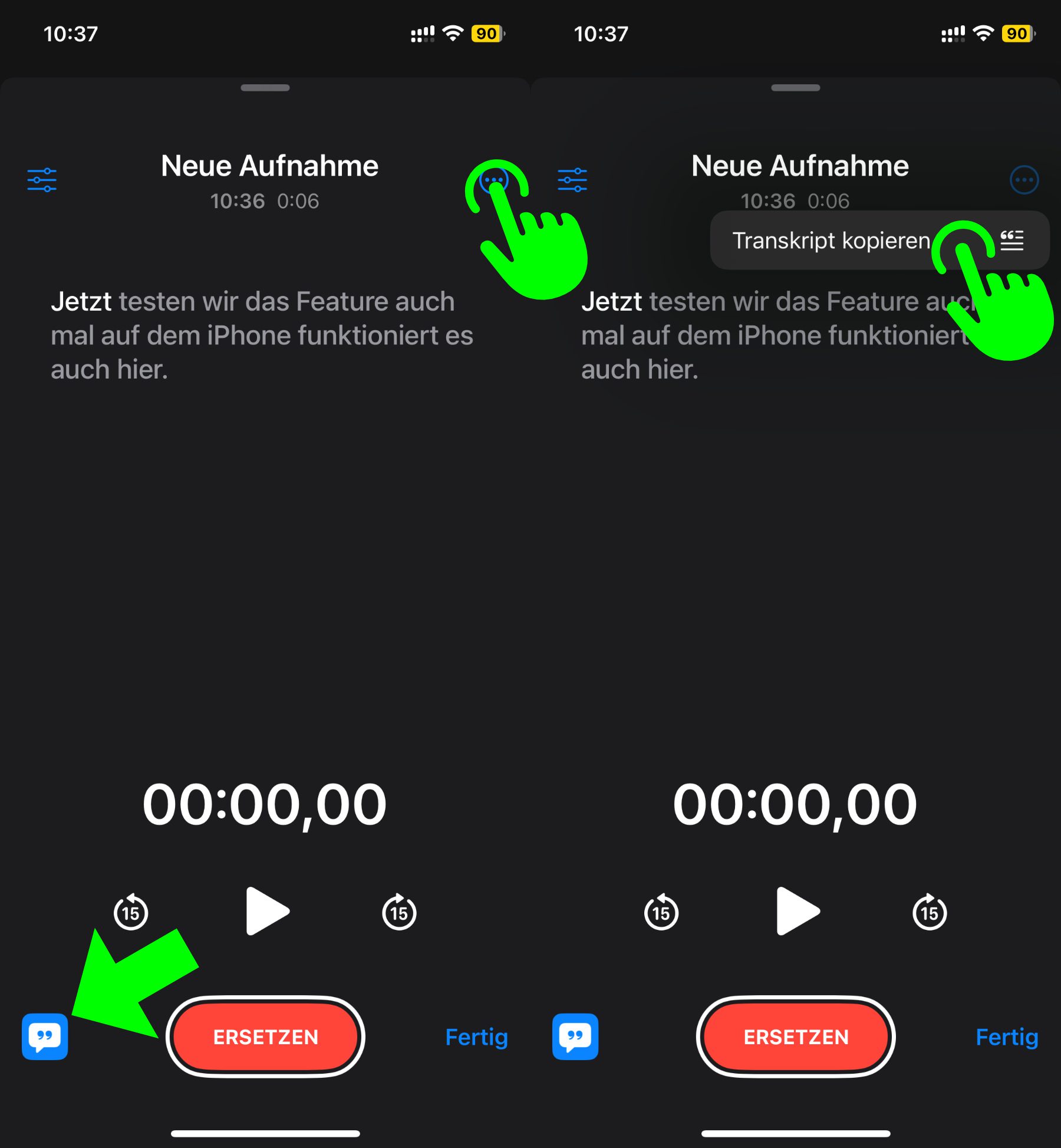 Um den Text weiterverwenden zu können, lässt er sich auch hier kopieren. Dazu einfach oben rechts neben dem Aufnahme-Titel auf die drei Menüpunkte tippen und dann „Transkript kopieren“ auswählen. Das soll auch für Aufnahmen möglich sein, die vor dem iOS-Update angelegt wurden.