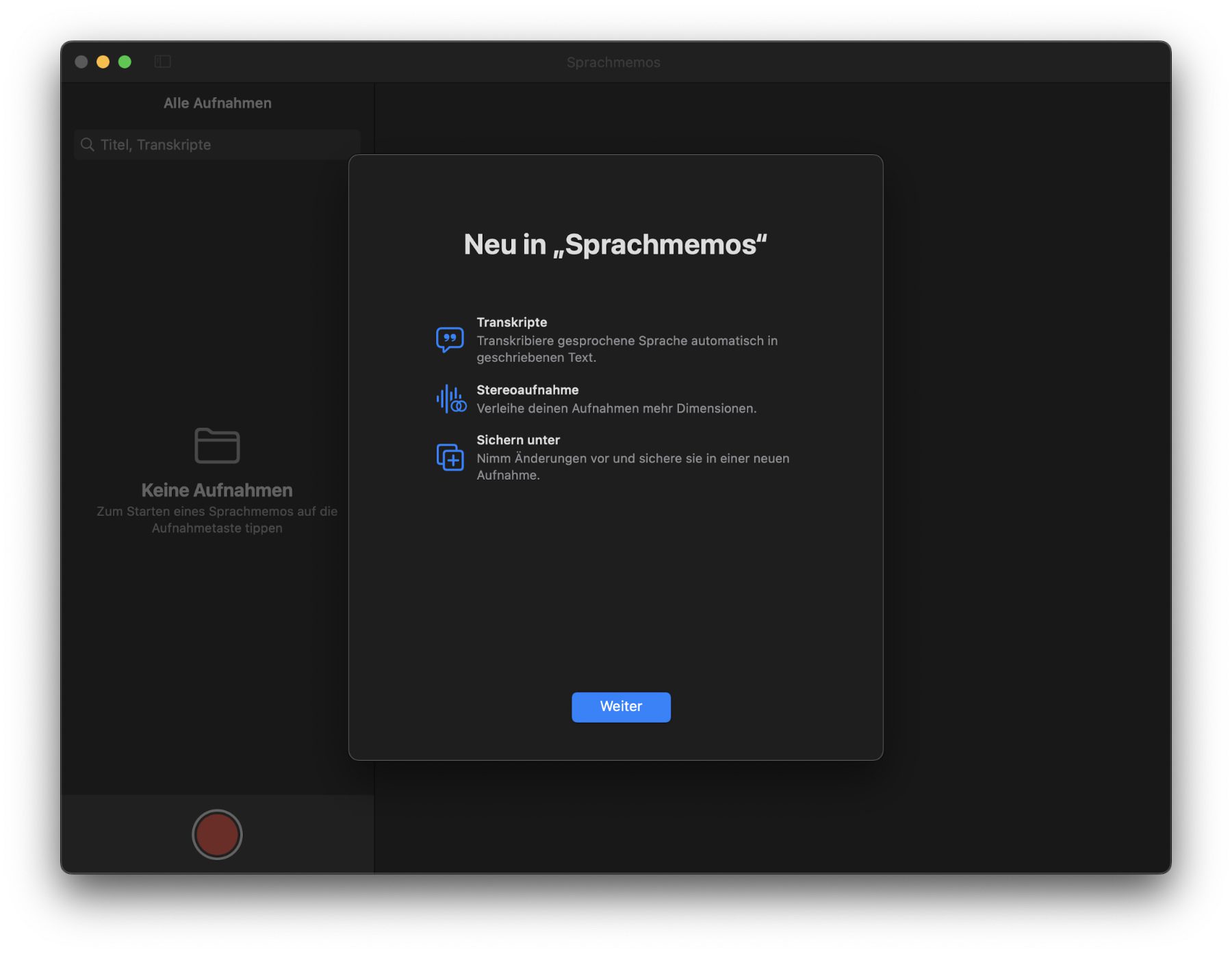 Am Mac zeigt die Sprachmemos App beim ersten Öffnen nach dem Update auf macOS 15.4 bereits die neuen Funktionen auf. Neben Transkripten von Aufnahmen in deutscher Sprache sind demnach auch Stereoaufnahmen (mit kompatiblen Geräten) sowie das separate Speichern von bearbeiteten Aufnahmen möglich.