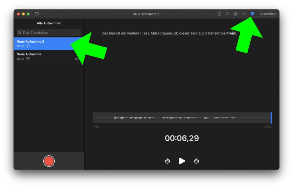 Neben den Einzelansicht einer Sprachnotiz können die Sprache-zu-Text-Ergebnisse auch in der allgemeinen Übersicht aller Aufnahmen aufgerufen werden. Dazu wird in der linken Seitenleiste erst einmal die gewünschte Aufnahme angeklickt. Anschließend wird oben rechts wieder die Sprechblase ausgewählt. Schon kann man den Text sehen.