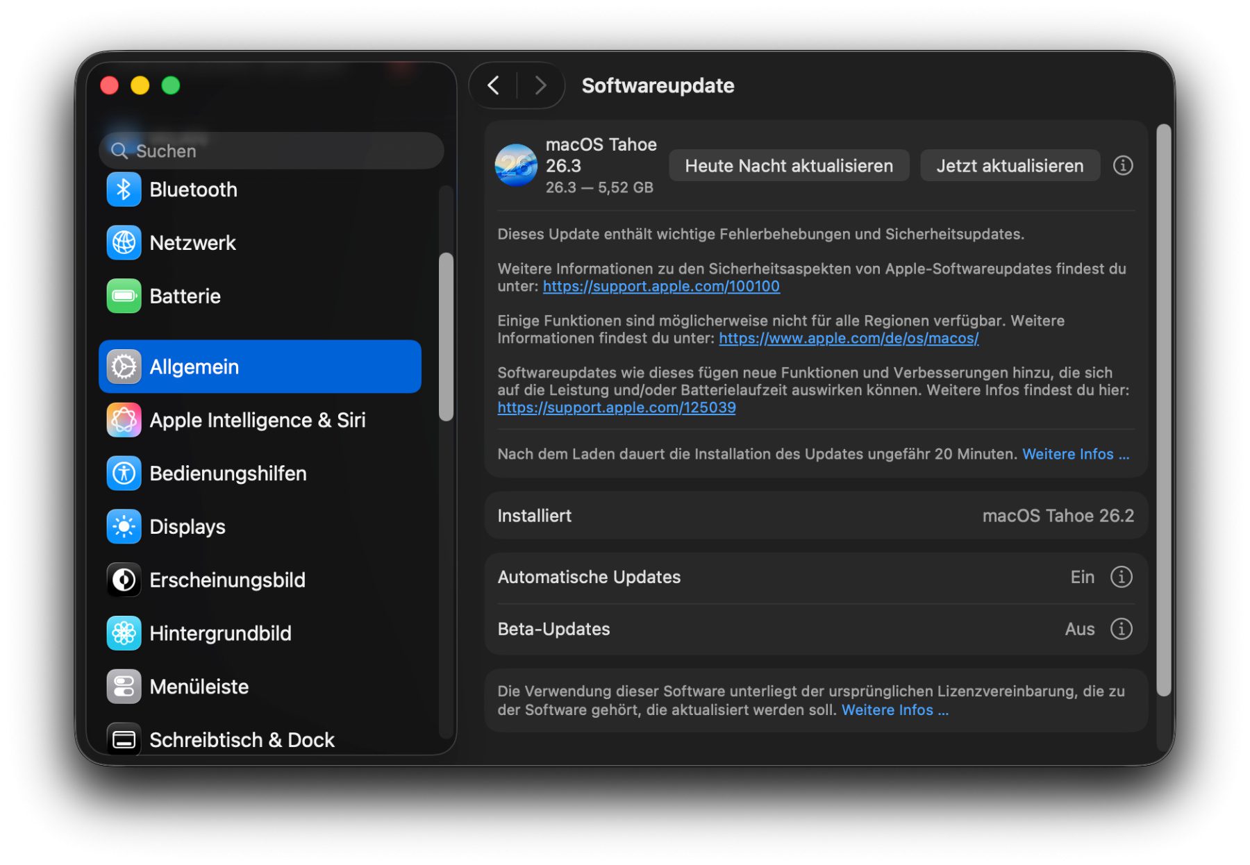 Auf dem Apple Mac wählt man in den Systemeinstellungen den Bereich Allgemein aus und klickt in diesem auf Softwareupdate. Dort sollte dann die Option zur Installation von macOS 26.3 angezeigt werden.