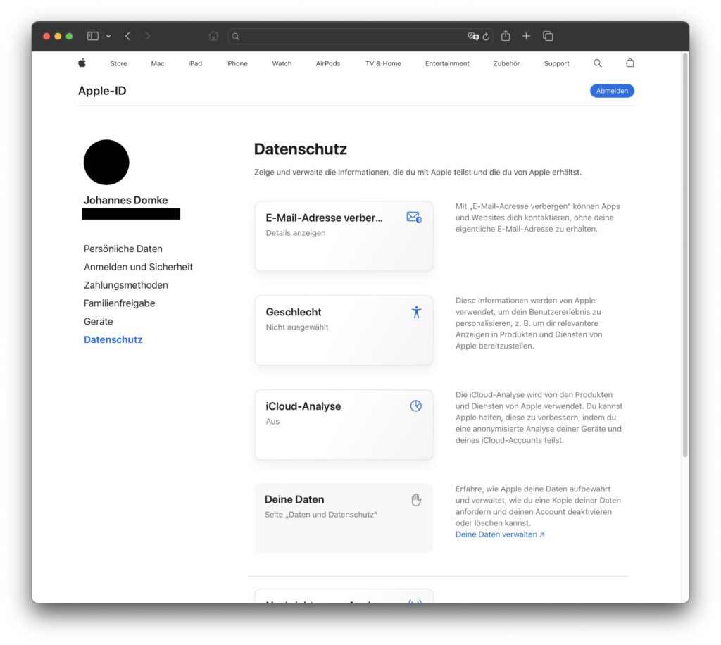Habt ihr euch auf der Apple-ID-Webseite angemeldet, dann findet ihr unter eurem Avatar, eurem Namen und der E-Mail-Adresse eurer Apple-ID das Menü der Seite. Dessen erster Punkt heißt „Persönliche Daten“. Klickt ihr da drauf, dann ordnen sich rechts vier Kacheln an: Name, Geburtsdatum, Land/Region und Sprache. Das ist alles ziemlich selbsterklärend. Denn klickt ihr eine der Kacheln an, könnt ihr die entsprechende Angabe ändern.