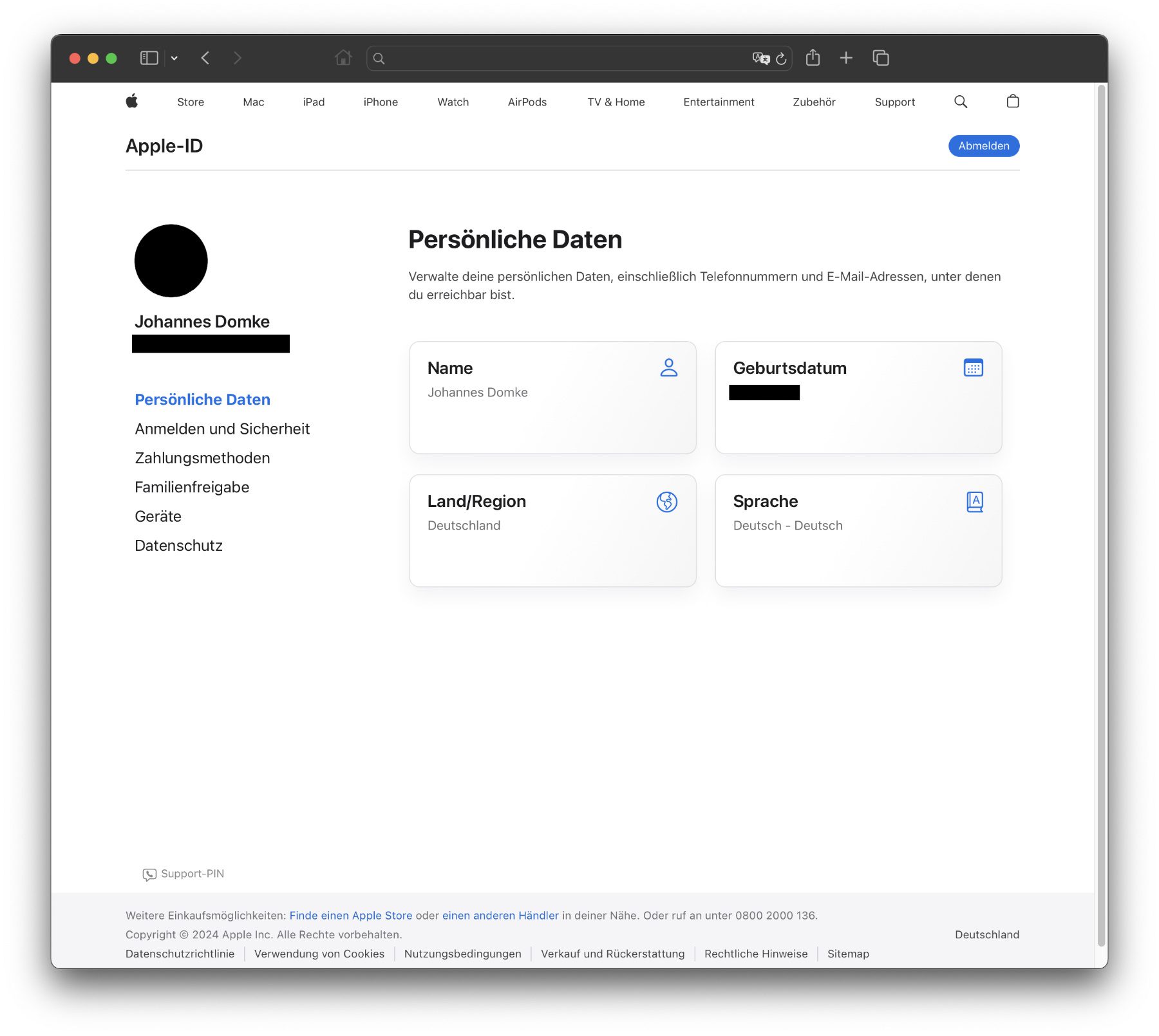 Habt ihr euch auf der Apple-ID-Webseite angemeldet, dann findet ihr unter eurem Avatar, eurem Namen und der E-Mail-Adresse eurer Apple-ID das Menü der Seite. Dessen erster Punkt heißt „Persönliche Daten“. Klickt ihr da drauf, dann ordnen sich rechts vier Kacheln an: Name, Geburtsdatum, Land/Region und Sprache. Das ist alles ziemlich selbsterklärend. Denn klickt ihr eine der Kacheln an, könnt ihr die entsprechende Angabe ändern.