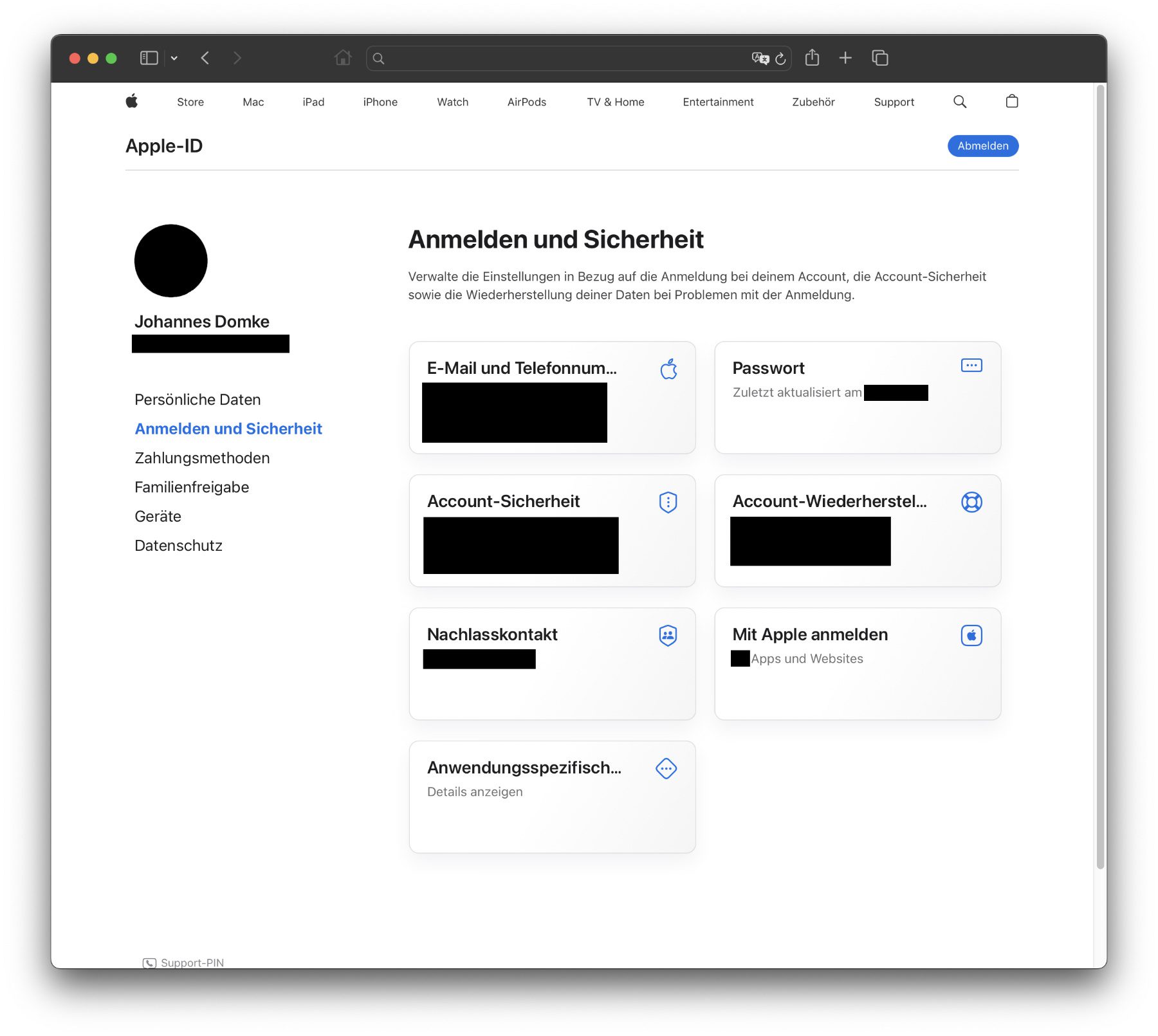 - Nachlasskontakt: Hier kann man einsehen, welcher Kontakt Zugriff auf die Apple-ID-Daten erhalten kann, wenn man verstirbt. Den Nachlasskontakt kann man hier auf der Webseite aber nicht einrichten – dies geht nur auf einem Apple-Gerät.