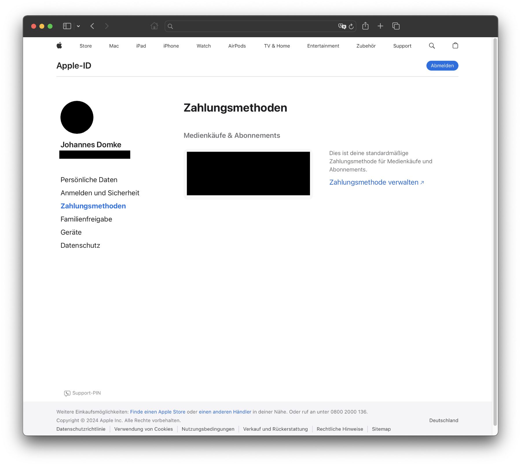 Hier könnt ihr einsehen, welche Zahlungsmethoden (z. B. Kreditkarten) für Abonnements, App- und Medienkäufe bei Apple hinterlegt sind. Diese können im App Store, im iTunes Store, im Apple Onlineshop und so weiter genutzt werden.