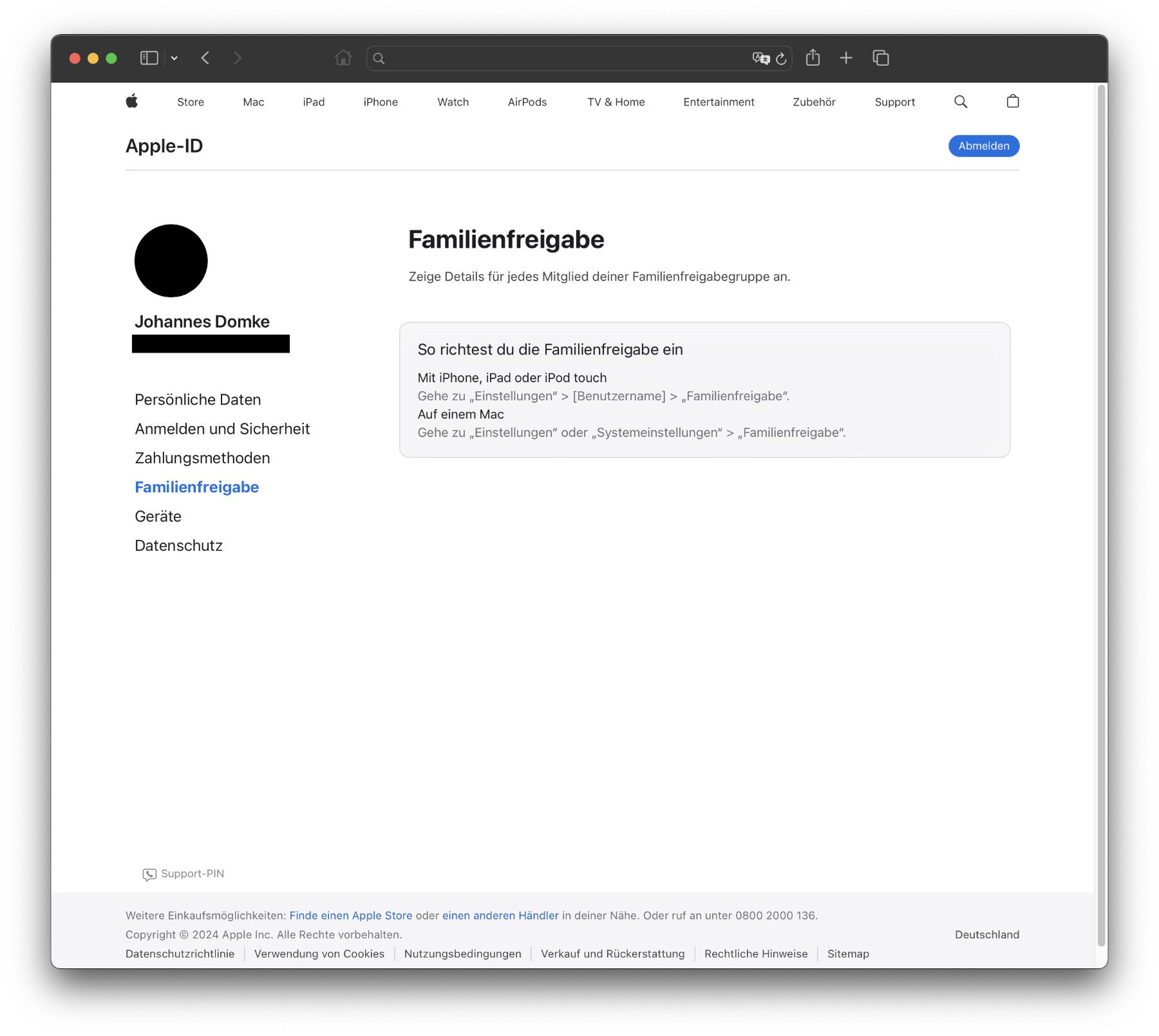 Hier findet ihr die Details zur Familienfreigabe und zu den Mitgliedern eurer entsprechenden Gruppe. Einrichten und verwalten könnt ihr die Freigabe hier aber nicht; dazu ist ein Apple-Gerät statt der Webseite nötig.