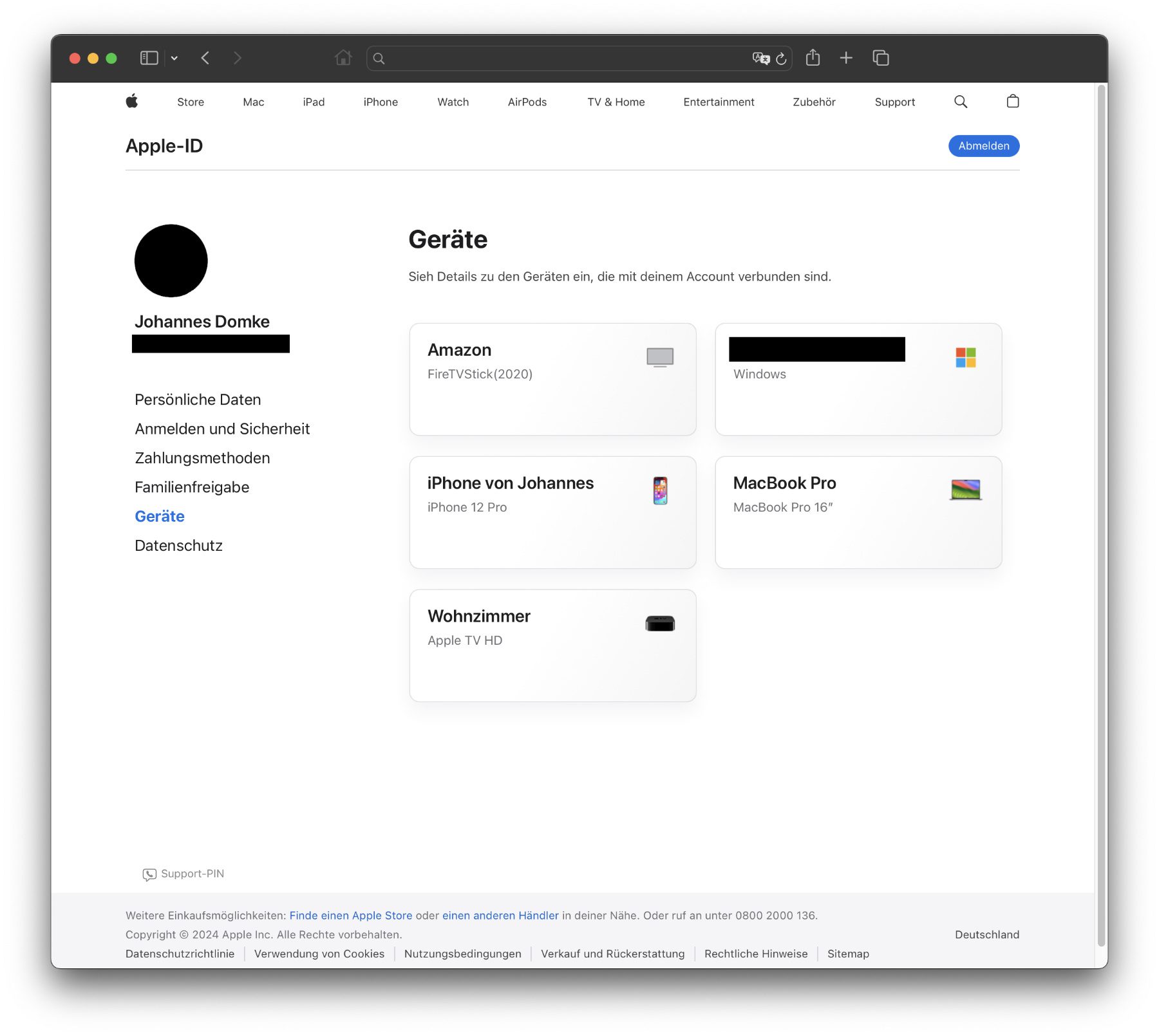 Hier findet ihr alle Geräte, die mit eurer Apple-ID verbunden sind. Darunter können neben Apple-Geräten wie dem Mac, iPhone, iPad, Apple TV, der Apple Watch und dergleichen auch Windows-PCs, Android-Geräte, Smart-TVs, Amazon Fire TV-Sticks sowie weitere sein. Je nachdem, wo ihr euch mit der Apple-ID angemeldet habt bzw. welchem Gerät beim Anmeldeprozess vertraut werden soll. Für Apple-Geräte könnt ihr hier deren Seriennummer und IMEI abrufen, die „Wo ist?“-Suche ansteuern (Weiterleitung zur iCloud-Webseite) sowie Infos zum Modell, zu den Telefonnummern, zur installierten Betriebssystem-Version und so weiter abrufen.