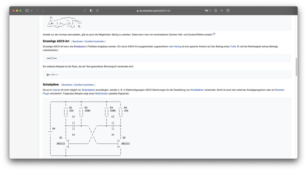 Von der einfachen, stilisierten Darstellung von Personen, Tieren, Objekten und Konzepten vermittels Zeichenfolgen auf wenigen Zeilen hin zu umfangreichen Bildern in großen Rastern ist vieles möglich. Mir ist es nicht gelungen, hier im Blog ASCII-Kunst in Textform einzubinden, die in allen Browsern und auf allen Geräten gleich gut dargestellt werden könnte. Deshalb möchte ich euch auf die Wikipedia-Seite zum Thema verweisen. Dort gibt es zahlreiche Beispiele, die gut aussehen – u. a. ein Bild von Garfield, eine Usenet-Signatur mit einer schlafenden Katze sowie Schaltpläne aus ASCII-Zeichen.
