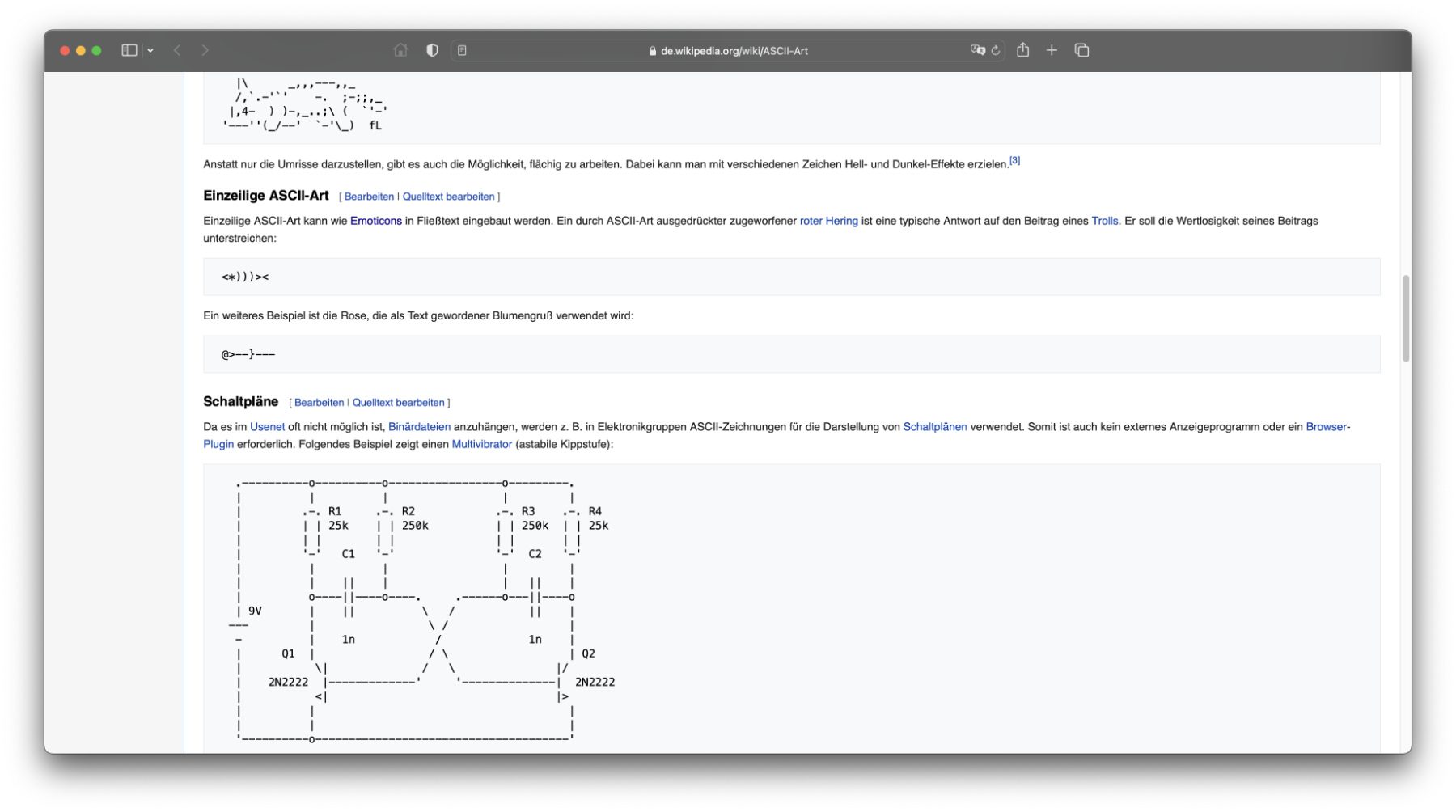 Von der einfachen, stilisierten Darstellung von Personen, Tieren, Objekten und Konzepten vermittels Zeichenfolgen auf wenigen Zeilen hin zu umfangreichen Bildern in großen Rastern ist vieles möglich. Mir ist es nicht gelungen, hier im Blog ASCII-Kunst in Textform einzubinden, die in allen Browsern und auf allen Geräten gleich gut dargestellt werden könnte. Deshalb möchte ich euch auf die Wikipedia-Seite zum Thema verweisen. Dort gibt es zahlreiche Beispiele, die gut aussehen – u. a. ein Bild von Garfield, eine Usenet-Signatur mit einer schlafenden Katze sowie Schaltpläne aus ASCII-Zeichen.