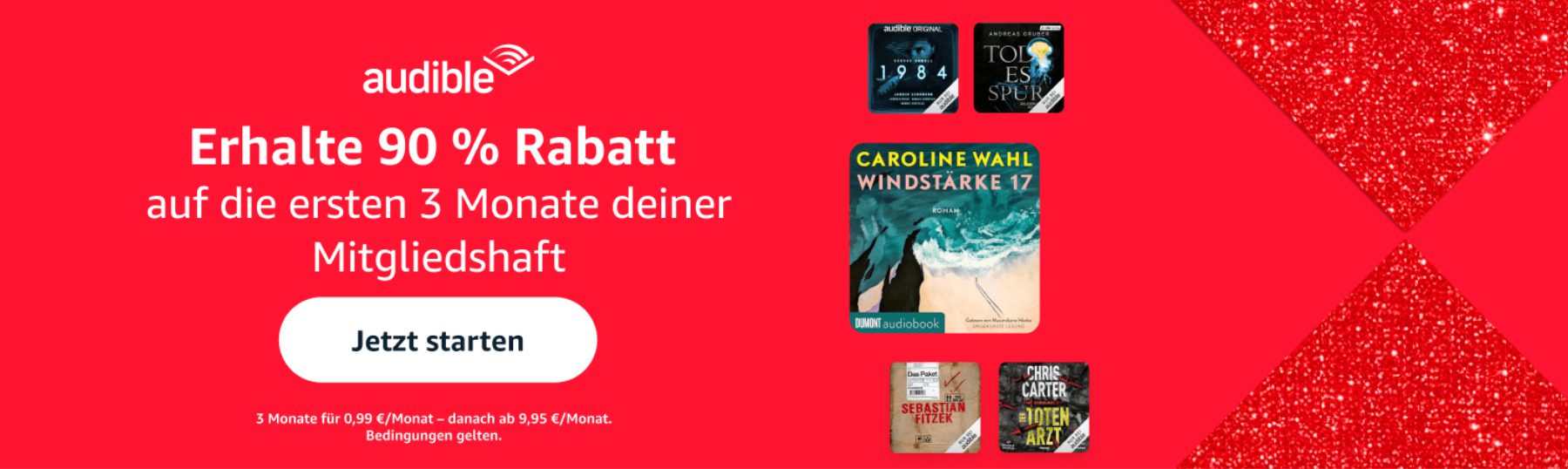 Das Hörbuch-Angebot von Amazon, der Audible-Dient, bietet derzeit wieder drei Monate für jeweils nur 99 Cent an. Regulär kostet die Mitgliedschaft 9,99 Euro im Monat, weshalb sich der aktuelle Deal mit 90% Rabatt ordentlich lohnt. Pro Monat kann ein Hörbuch ausgesucht und für immer in der Audible-Bibliothek behalten werden. Zudem gibt es Inklusiv-Angebote, die ohne zusätzliches Guthaben während der bezahlten Mitgliedschaft in unbegrenzter Menge angehört werden können. Das Rabatt-Angebot gilt auch für alle, die bereits Audible genutzt haben, die Mitgliedschaft aber gerade pausieren.