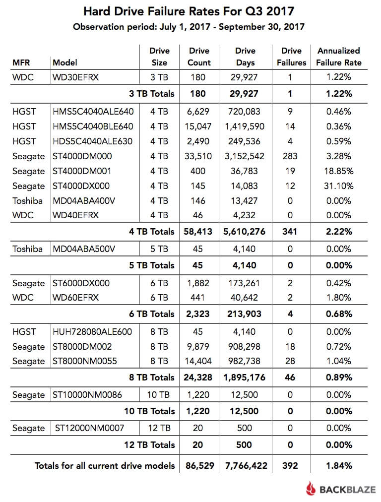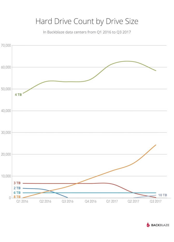 Seit dem Q2/2017 Report im September dieses Jahres wurden beim Backup-Anbieter 9.599 Festplatten zur Cloud hinzugefügt und 6.221 Festplatten in den Ruhestand geschickt. Platten mit einem oder zwei Terabyte findet man nun nicht mehr in der Übersicht, und auch die mit 3TB werden weniger. Stark zugenommen haben die 8TB Platten, und auch die oben schon erwähnten Speicher mit Werten im zweistelligen TB-Bereich werden mehr.