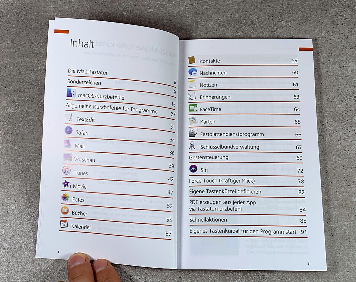 Das Buch ist zwar mit etwas über 90 Seiten kein dicker Schinken, aber dafür bietet es eine gut strukturierte Übersicht über die wichtigsten (oder alle?!) Kurzbefehle, die man in diversen Programmen und im Finder unter macOS nutzen kann, um effektiver zu arbeiten. Die Zusammenstellung als Buch finde ich besonders für Mac-Neulinge hilfreich, denn so setzt man sich vielleicht mal aufs Sofa und liest ein bisschen in den Tastaturkombinationen.