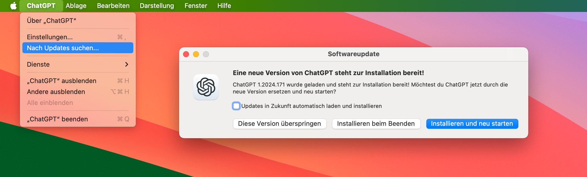 Erfreulicherweise hat OpenAI recht flott nach Bekanntwerden der Sicherheitslücke reagiert und ein Update der Mac-App veröffentlicht. Wenn ihr nicht sicher seid, welche Version ihr nutzt, öffnet die ChatGPT-App und klickt in der Menüleiste auf "ChatGPT" und dann auf "Nach Updates suchen". Bei mir wurde dann ein Update angeboten (siehe Screenshot).