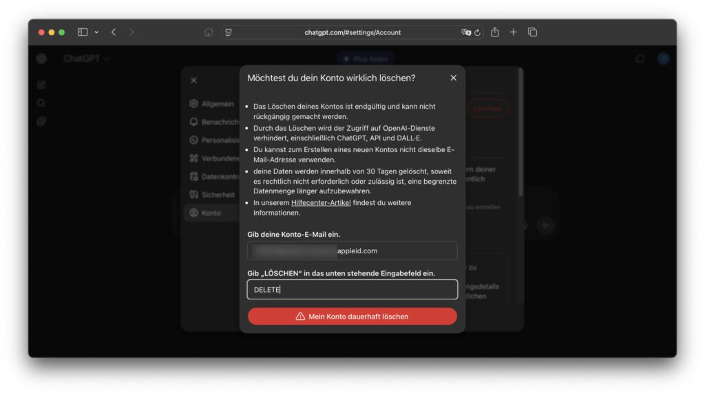 Dann hatte ich aber einen Einfall: Was ist, wenn das Formular zum Löschen des OpenAI-Kontos einfach nur eine schlechte Übersetzung ist und die Textfeld-Abfrage nicht aus dem Englischen ins Deutsche übertragen wurde? Dann müsste als geforderte Eingabe das Wort DELETE hinterlegt sein.