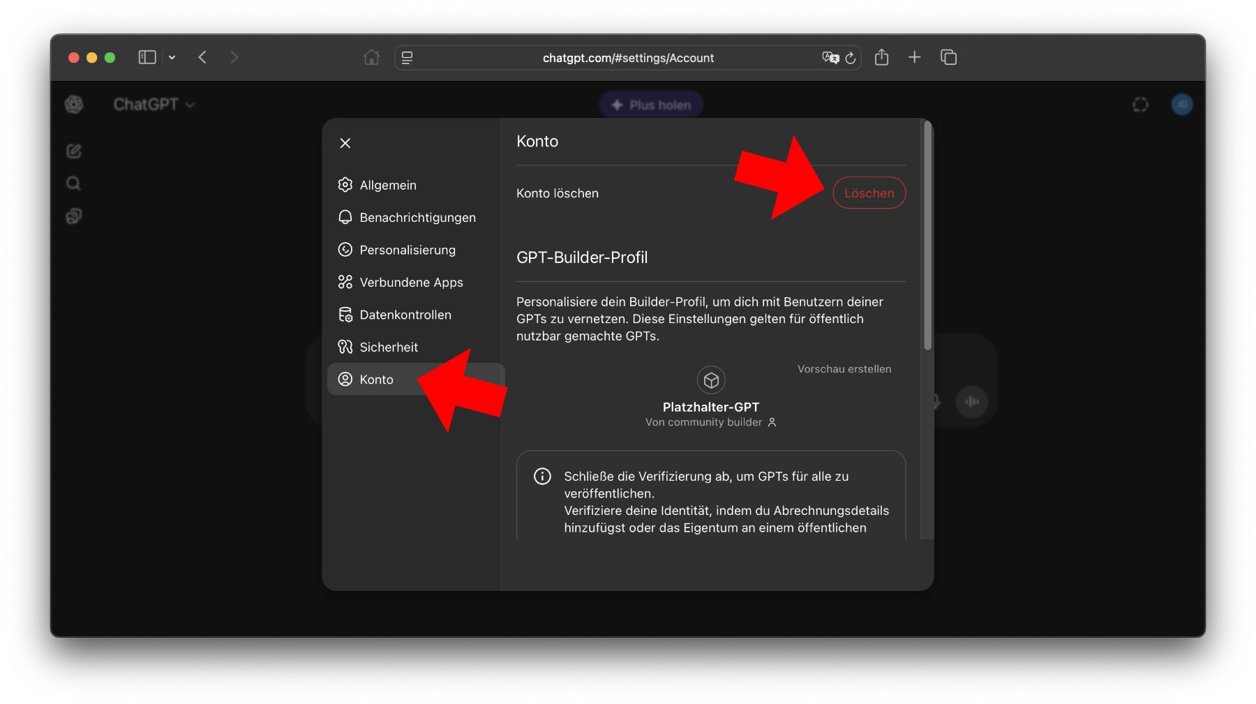 - In der linken Seitenleiste Konto auswählen und dann rechts auf Löschen klicken