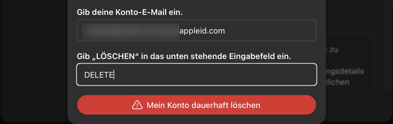 - Die E-Mail-Adresse des Accounts und DELETE in die jeweiligen Textfelder eingeben