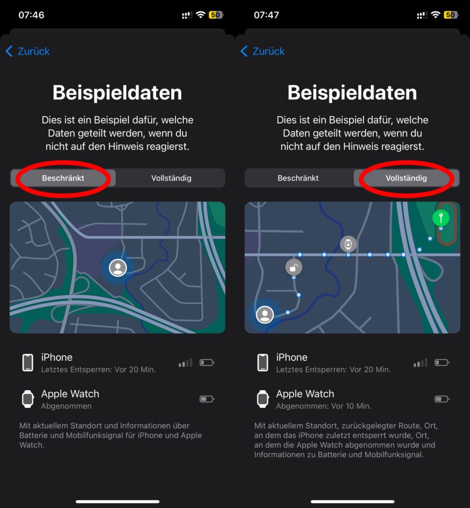 Seid ihr euch bei einer bestimmten Route so gar nicht sicher, was euch erwartet, dann schickt lieber vollständige Daten. Denn so erfahren die ausgesuchten Kontakte nach Ablauf der Zeit bzw. wenn ihr nicht ankommt, welchen Weg ihr gewählt habt, wann ihr das iPhone zuletzt entsperrt habt und / oder wann ihr die Apple Watch abgelegt habt, und so weiter. Zudem werden das Mobilfunksignal und der Akkustand übermittelt. Ansonsten nutzt die beschränkten Daten, um im Ernstfall lediglich Mobilfunksignal, Akkustand und den aktuellen Standort des iPhones zu übermitteln.