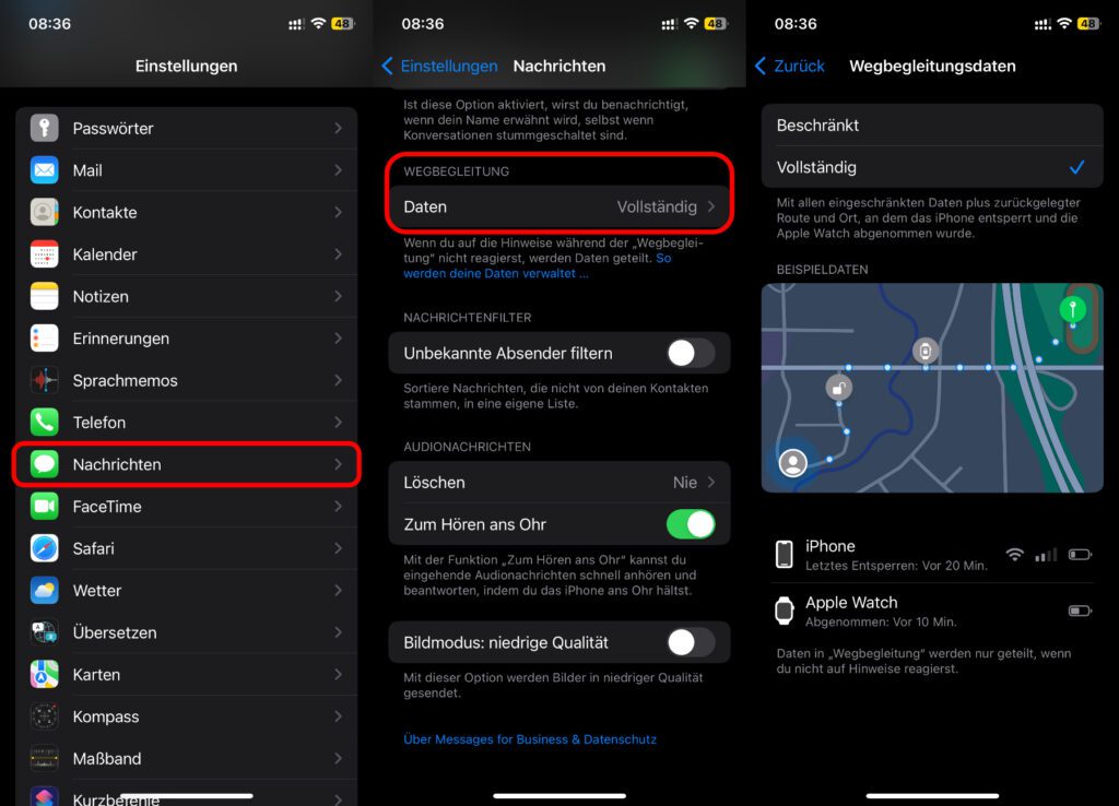 Unter Einstellungen -> Nachrichten -> Daten (im Bereich „Wegbegleitung“) lässt sich nachträglich ändern, ob man Daten „beschränkt“ oder „vollständig“ senden will. Im beschränkten Modus werden der letzte Standort sowie Informationen zum Akkustand und Mobilfunksignal von iPhone und Apple Watch übersendet. Im vollständigen Modus werden zusätzlich die zurückgelegte Route inkl. der Orte angezeigt, an denen man das iPhone entsperrt bzw. die Apple Watch abgenommen hat. Details dazu weiter unten.