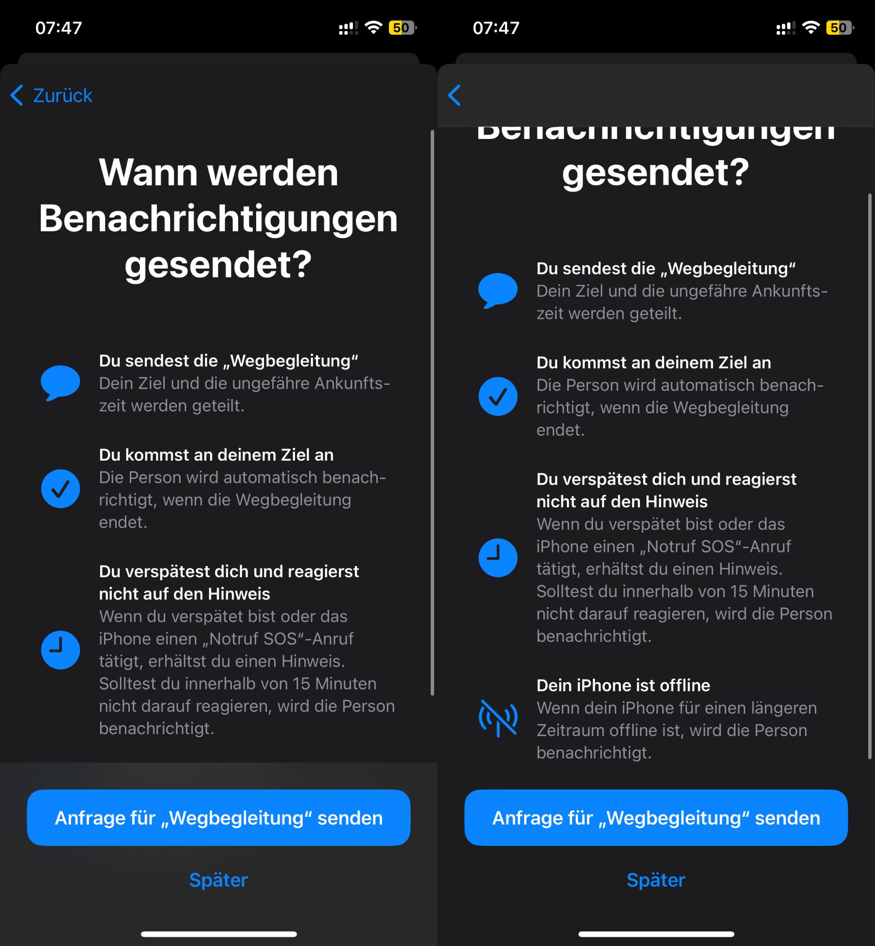 Nutzt man die neue Funktion für den sicheren Nachhauseweg und die überwachte Reise das erste Mal, dann gibt es bildschirmfüllende Hinweise und Anleitungen. Diese sollte man sich anschauen und durchlesen sowie dann erst auf „Fortfahren“ tippen. Darin kann man nun auch auswählen, ob Daten beschränkt oder vollständig geschickt werden. Dies lässt sich später in den Einstellungen des iPhones anpassen.