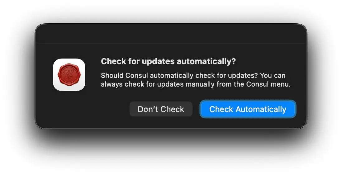 Dann fragt Consul, ob automatisch nach Updates gesucht werden soll. Da diese aktuell in hoher Frequenz erscheinen (s. Changelog), empfehle ich den Auto-Check: