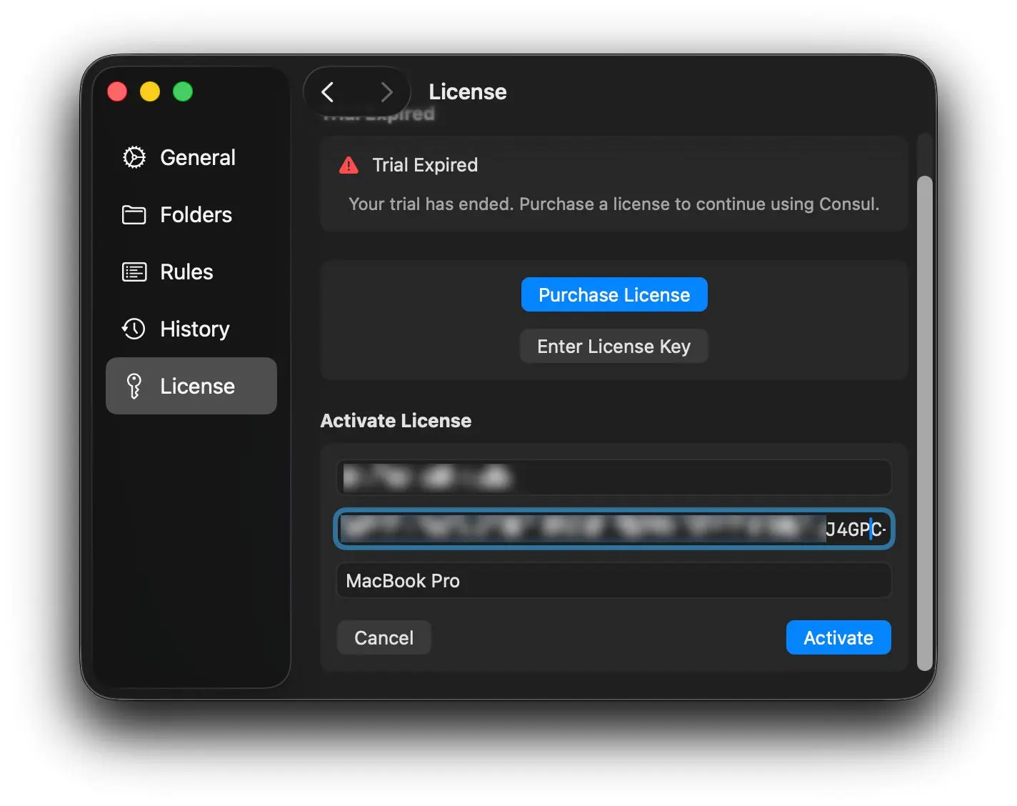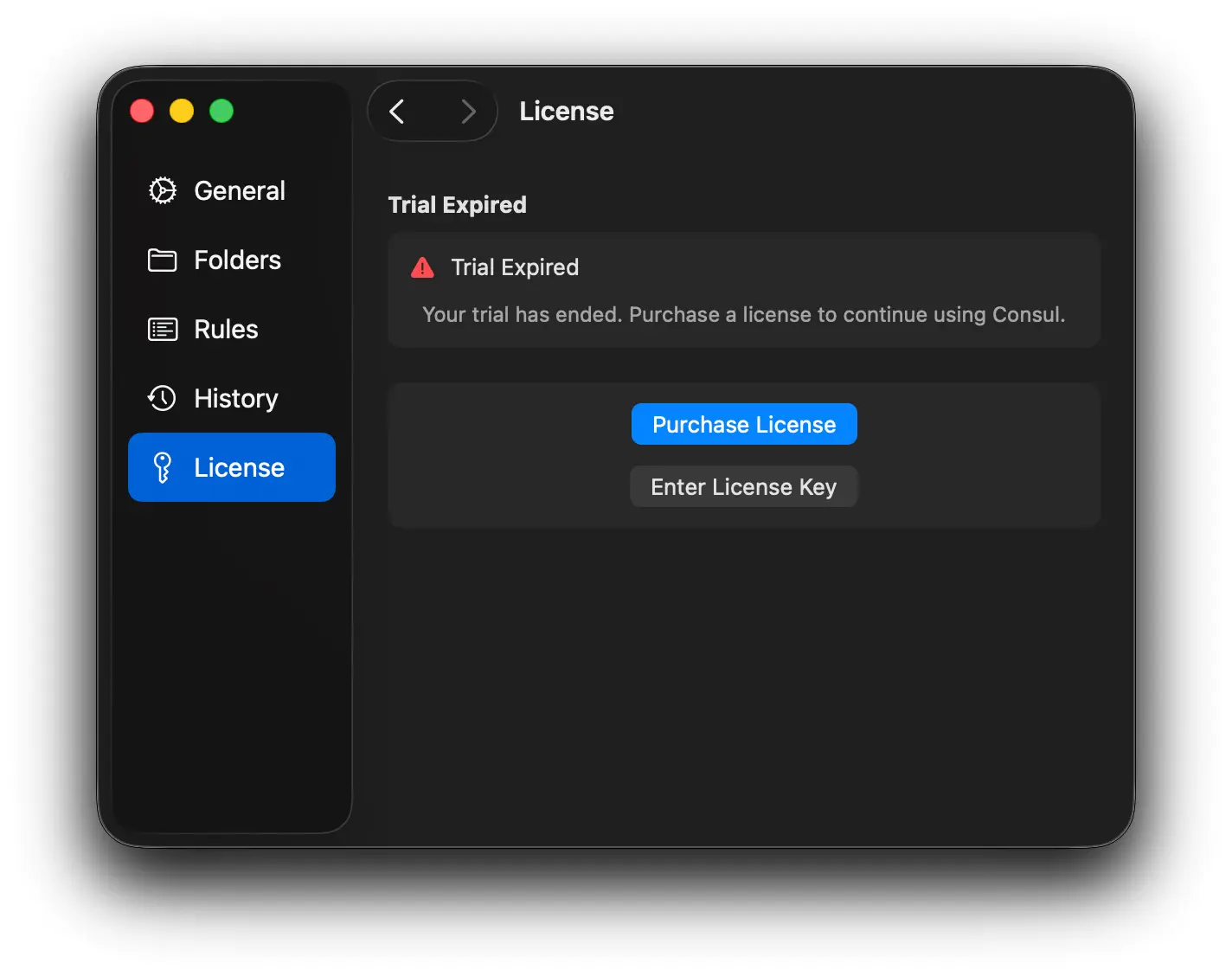 Zudem gibt es einen „Purchase“-Button, über den man eine Consul-Lizenz kaufen kann. Diesen findet man zudem in den Consul-Einstellungen, wo es außerdem den „Enter License Key“-Button gibt: