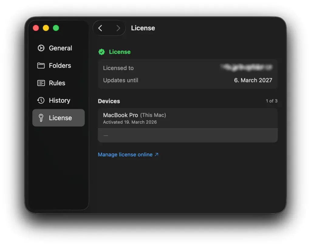 Die Pro-Lizenz für 19 US-Dollar kann an drei Macs gleichzeitig verwendet werden. Die Übertragung auf andere Macs mit der Abmeldung auf den zuvor genutzten ist allerdings möglich. Auch hier gibt es ein Jahr lang Updates.