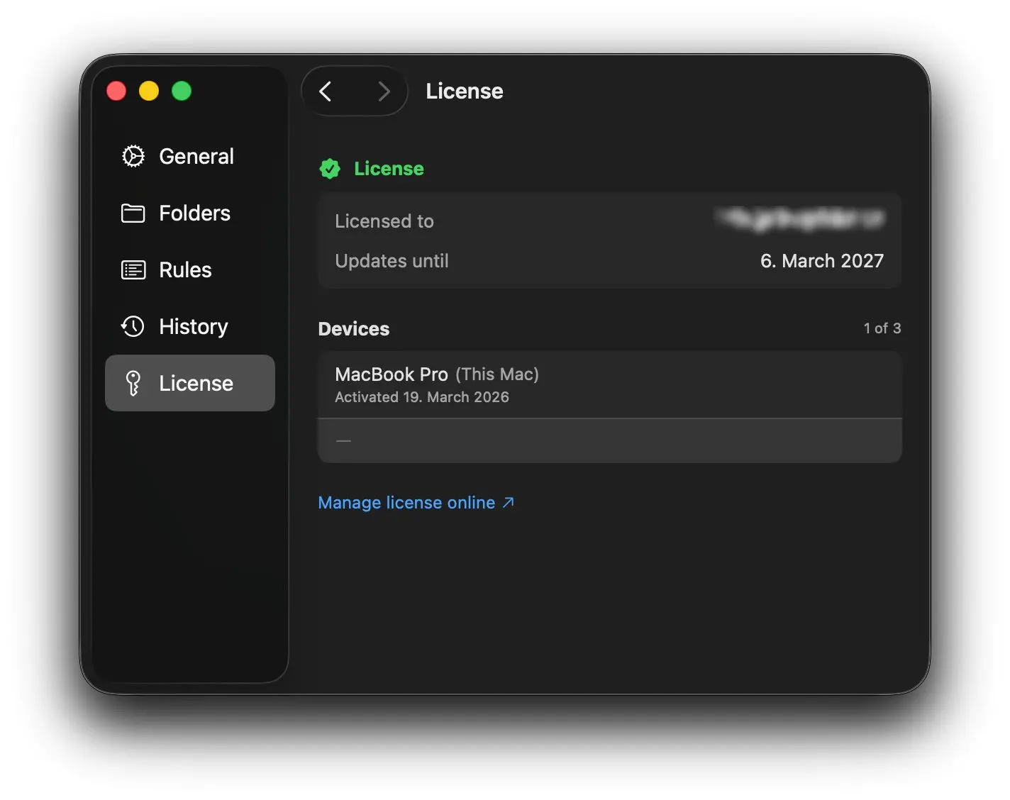 Ist die Lizenz erfolgreich eingetragen, wird angezeigt, wie lange man noch Updates bezieht (der Kauf bringt ein Jahr lang Updates mit). Aber auch darüber hinaus kann die zum Stichtag letzte Version weiter genutzt werden: