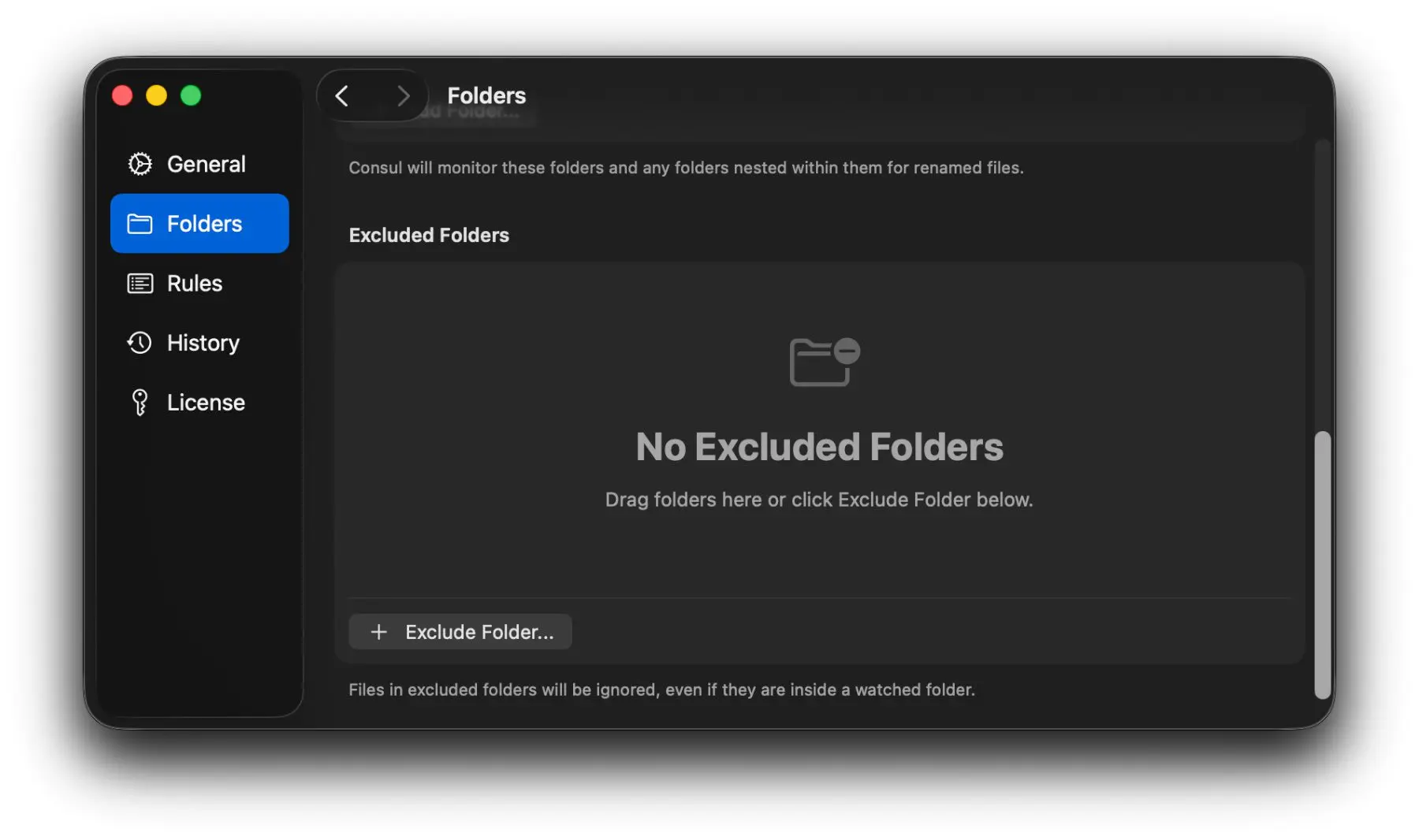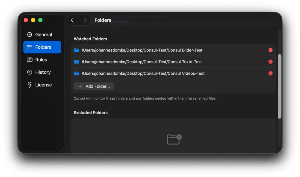 Die ausgesuchten oder speziell eingerichteten Ordner lassen sich in den Consul-Einstellungen unter „Folders“ ganz einfach mit dem „+ Add Folder“-Button hinzufügen.