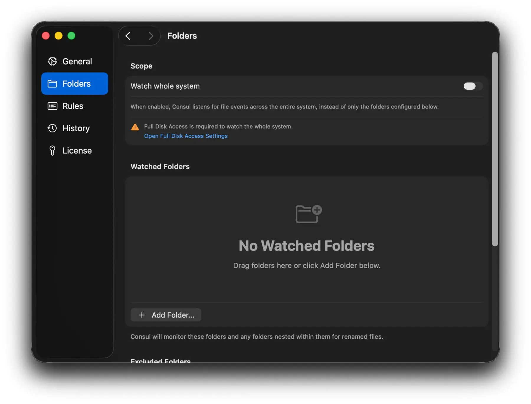 In den Consul-Einstellungen lässt sich unter „Folders“ einrichten, ob die App systemweit agieren soll (dafür muss der Vollzugriff aktiviert werden) oder ob bestimmte Ordner überwacht werden. Zudem lassen sich einzelne Ordner als Ausnahmen festlegen, sodass Consul dort nicht greift: