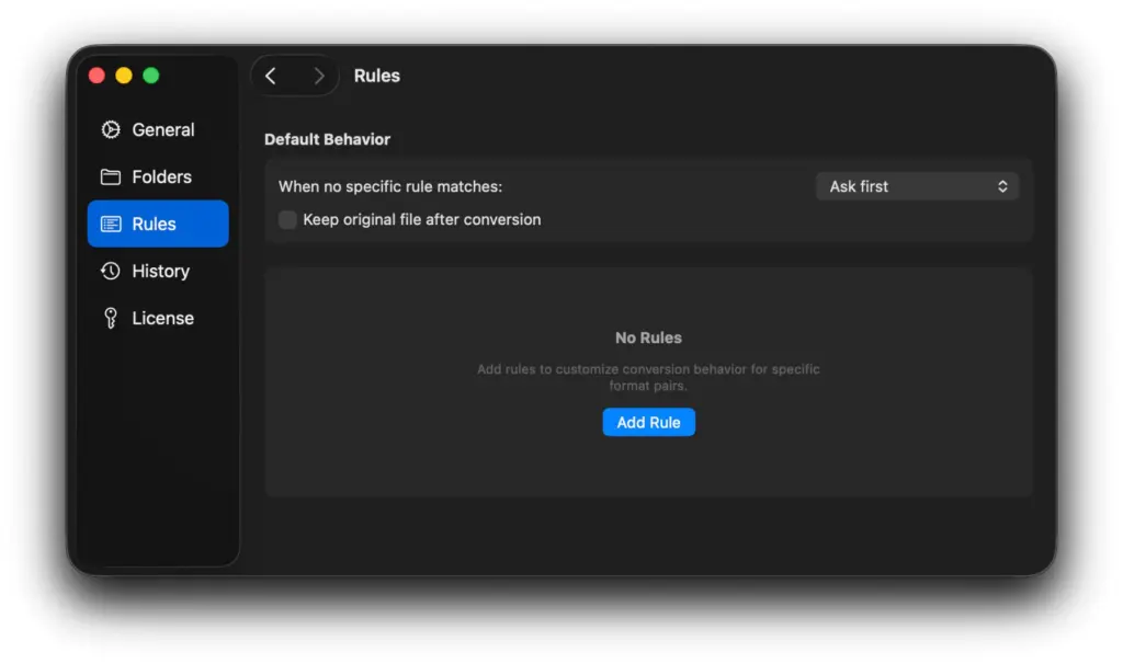 Dann steht neben „When no specific rule matches“ ein „Ask first“. Dies lässt sich zu „Convert immediately“ (sofort umwandeln) oder „Don’t convert“ (nicht umwandeln) ändern. Je nachdem, wie vorgegangen werden soll. Man kann z. B. „Convert immediately“ einstellen und dann „Ask first“-Regeln für bestimmte Einzelfälle festlegen: