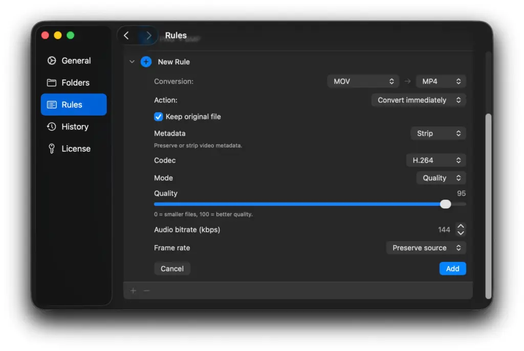 Ob die Original-Datei behalten werden soll, lässt sich global festlegen, aber auch individuell als Einzelregel einrichten. „Keep original file“ kann also entweder auf alle Umwandlungen oder nur auf ausgesuchte angewendet werden.