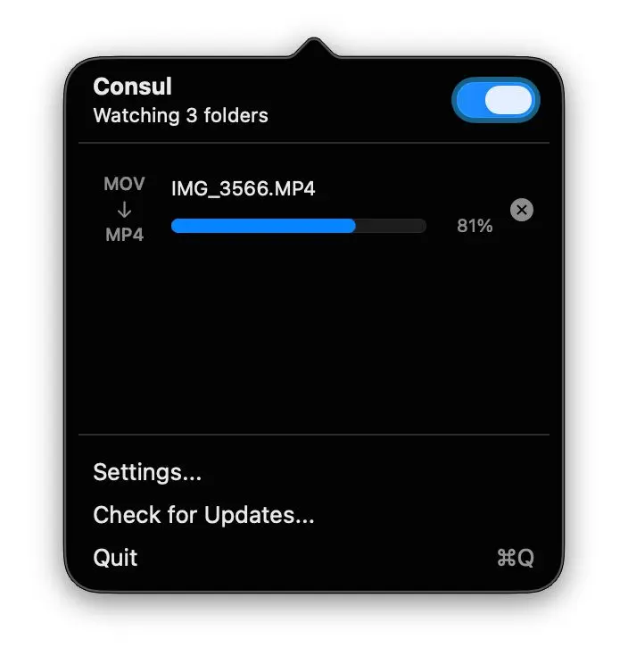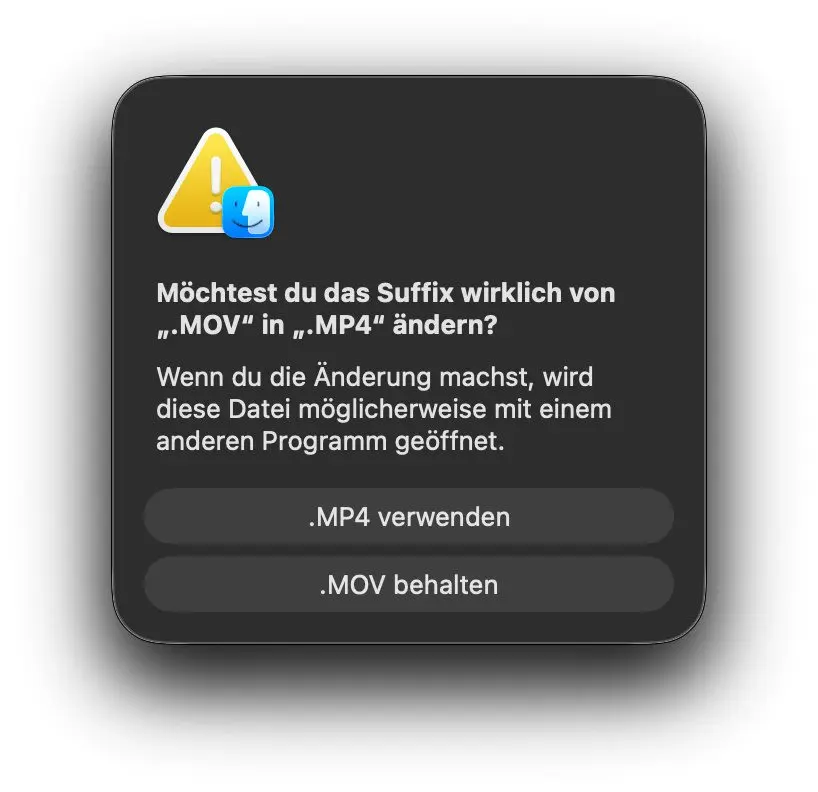 Nach dem Umbenennen hat sich erstmal macOS eingemischt und gefragt, ob ich das Dateiformat wirklich umändern will. Dies habe ich bestätigt. Anschließend hat das Menüleistensymbol von Consul einen Fortschrittsbalken für die Konvertierung angezeigt.