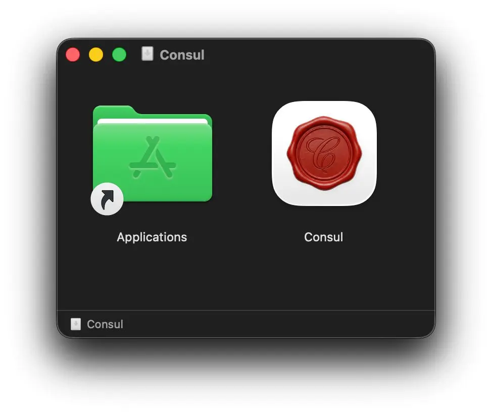 Nach dem Download der .dmg-Datei von der Consul-Webseite wird diese geöffnet und die App in den Programme-Ordner gezogen: