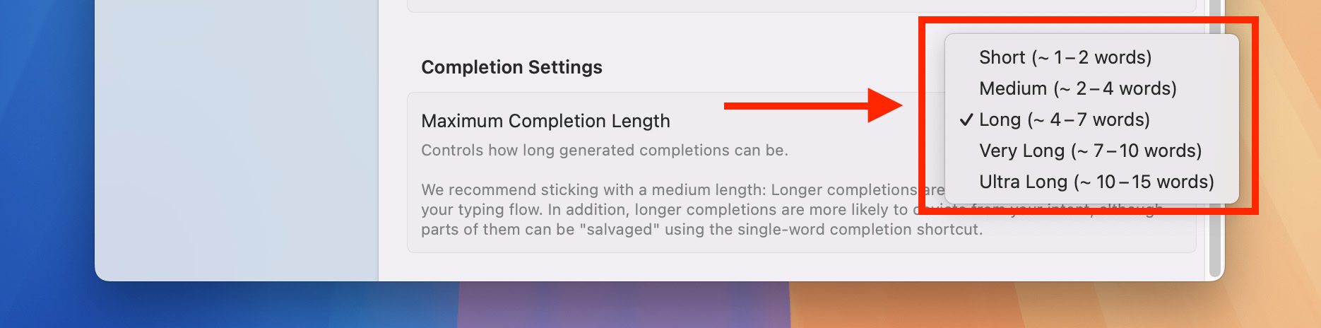 - Länge der Vorschläge: Unter "Complete Settings" könnt ihr festlegen, wie lang die Vorschläge sein sollen. Das reicht von 1–2 Wörtern bis hin zu "Very Long" mit 10–15 Wörtern. Ich hatte das anfangs auf "Very Long" gestellt, aber dann hat es auf meinem M1 Max teilweise zwei Sekunden gedauert, bis die Vorschläge kamen. Das war mir zu langsam, deshalb bin ich bei "Long" gelandet.