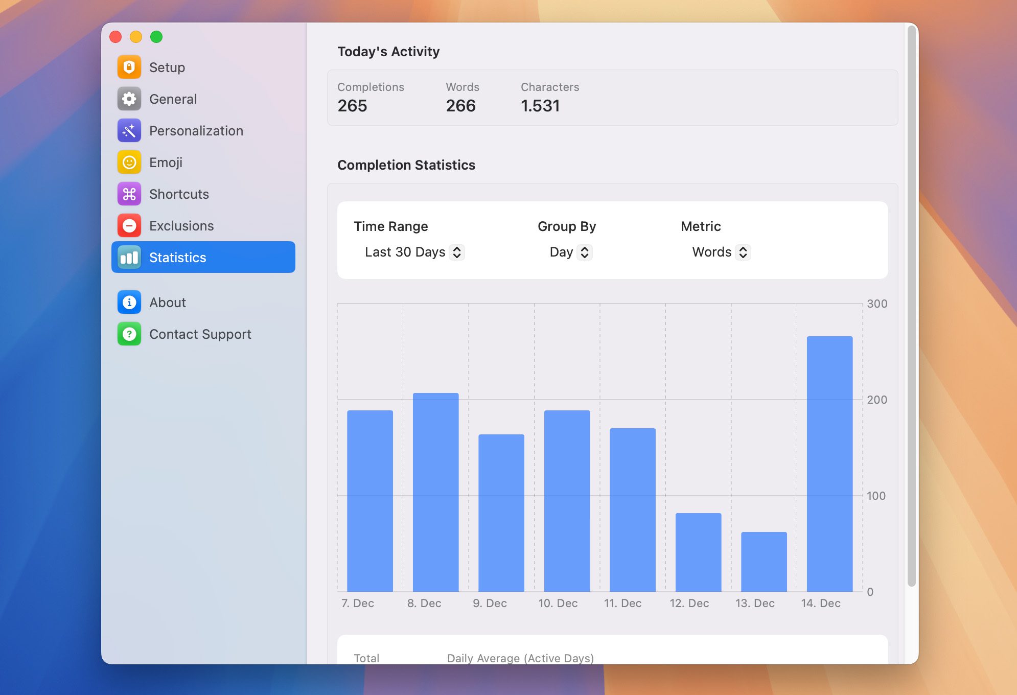 Cotypist zeigt mir in den Statistiken, dass ich täglich etwa 100 bis 200 Wörter durch die App vervollständigen lasse. Das klingt erstmal nicht nach viel, aber es sind eben genau die Momente, in denen man kurz überlegt, wie ein Satz weitergehen soll.