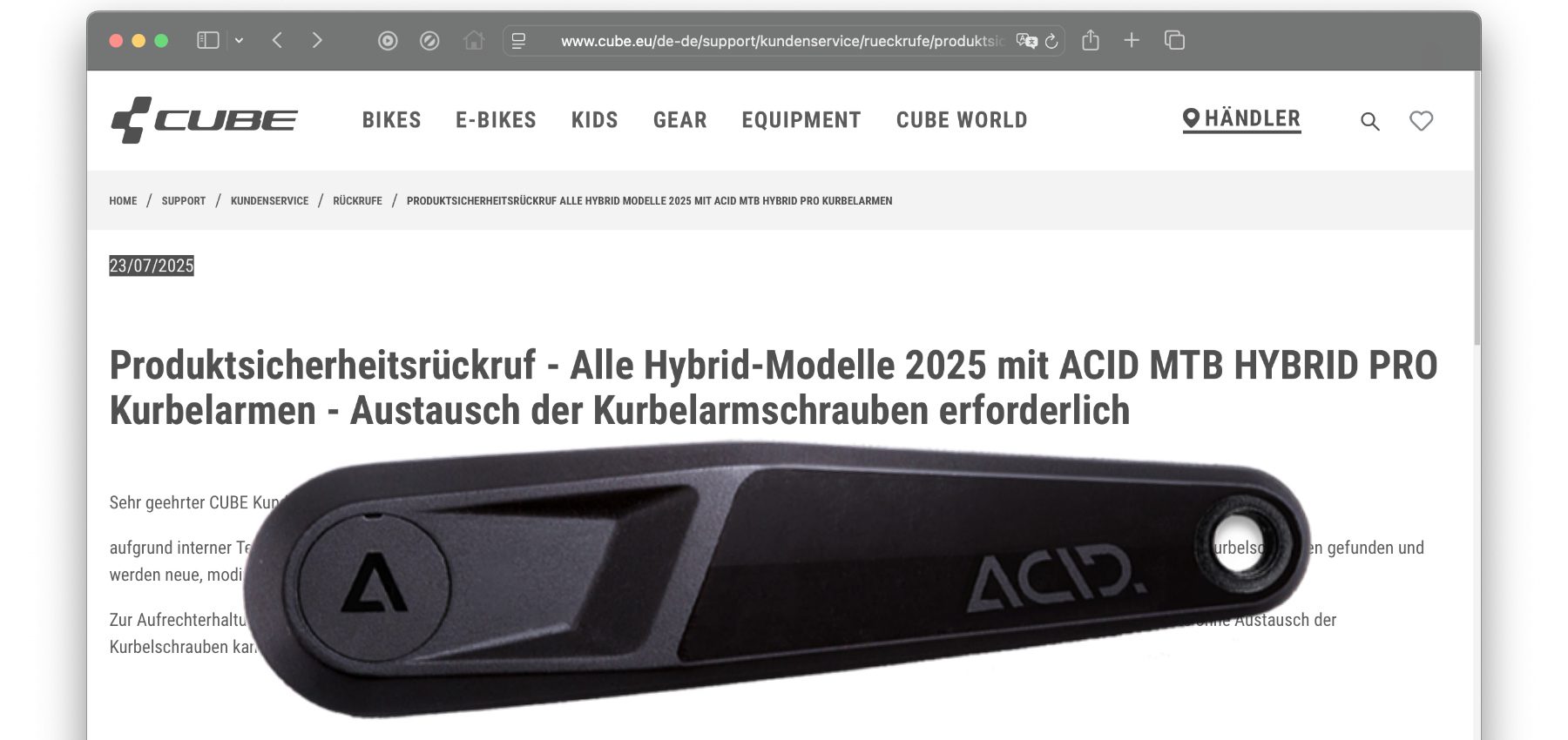 Der offiziellen CUBE Produktsicherheitsrückruf vom 23. Juli 2025 kann im Kundenservice-Bereich der Herstellerwebseite eingesehen werden. Darin heißt es, dass der Rückruf auf internen Tests sowie auf Rückmeldungen aus dem Markt fußt. Das heißt, es gibt wohl schon Fälle von sich während der Fahrt lösenden Kurbelarmen. Als Grund werden „möglicherweise fehlerhafte Kurbelschrauben“ genannt.